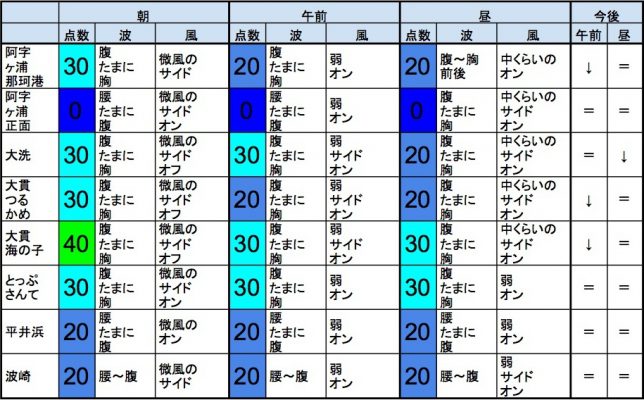 【茨城エリア】-“・茨城エリアは腹〜胸くらいの波、弱めの風のスタート、それほど良くなくても多少できそうなコンディションで、午前から昼にかけてもコンディションはそのままキープしそうです。午後から夕方にかけてはコンディションは多少落ちそうです。