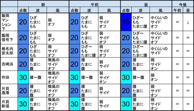 【千葉北 南部エリア】-・千葉北 南部エリアは腰〜腹くらいの波、弱めのオフショアベースの風のスタート、それほど良くなくても多少できそうなコンディションで、午前から昼にかけてもコンディションはそのままキープしそうです。午後から夕方にかけてもコンディションはそのままキープしそうです。-