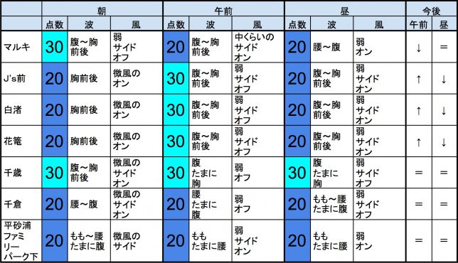 8月3日(金)朝の千葉南の波 2018年8月3日 / U / コメントする 【千葉南エリア】-“・千葉南エリアは胸前後くらいの波、弱めのオンショアベースの風のスタート、いまいちなコンディションで、午前から昼にかけても状況はあまり変わらなさそうです。午後から夕方にかけてもコンディションはあまり変わらなさそうです。 ・今もこの後もそれなりな感じで、早めなら、マルキ、千歳、あたり、後半なら、千歳、あたりが狙い目でしょうか。-“