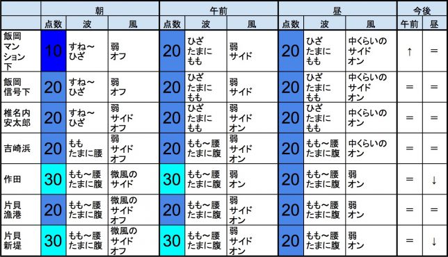 【千葉北 北部エリア】-“・千葉北 北部エリアはすね〜ひざくらいの波、弱めのオフショアベースの風のスタート、プアなコンディションで、午前から昼にかけても状況はあまり変わらなさそうです。午後から夕方にかけてもコンディションはあまり変わらなさそうです。-