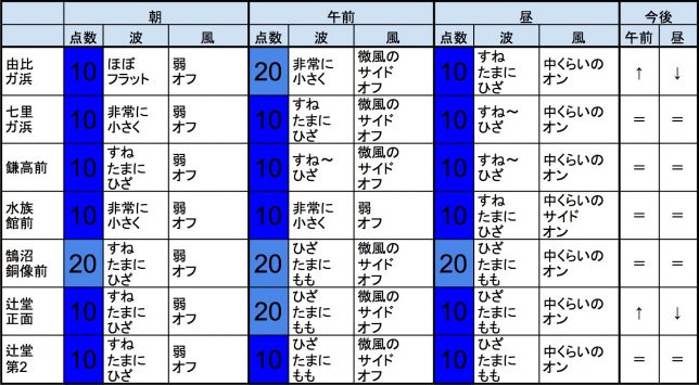 【湘南東エリア】-“・千葉南エリアは腰〜腹くらいの波、弱めのオンショアベースの風のスタート、いまいちなコンディションで、午前から昼にかけても状況はあまり変わらなさそうです。午後から夕方にかけてもコンディションはあまり変わらなさそうです。