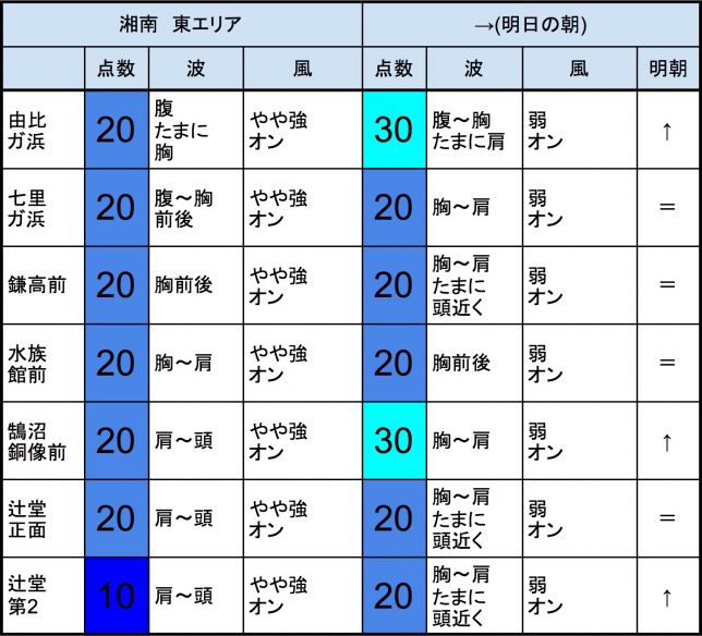 8月9日(木)最終〜明日8月10日(金)朝の湘南の波 2018年8月9日 / U / コメントする 【湘南東エリア】-“・明朝の湘南 東エリアは胸〜肩〜頭近くくらいの波、弱めのオンショアベースの風、いまいちなコンディションでのスタートとなりそうです。- 【湘南西エリア】-“・明朝の湘南 西エリアは胸〜肩くらいの波、弱めのオンショアベースの風、プアなコンディションでのスタートとなりそうです。 ・由比ガ浜、鵠沼銅像前、湯河原吉浜、周辺あたりでは、多少期待できそうでしょうか。-“