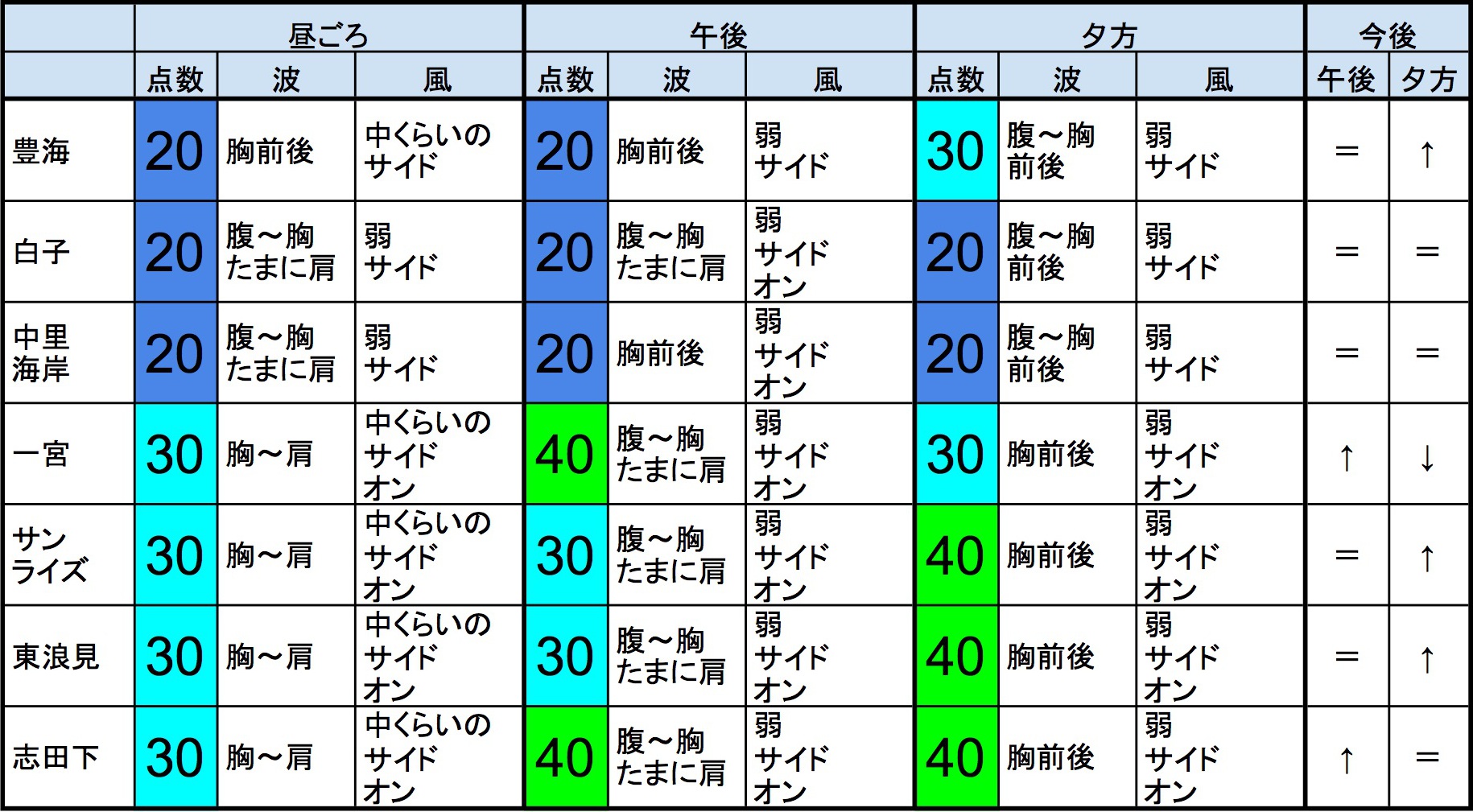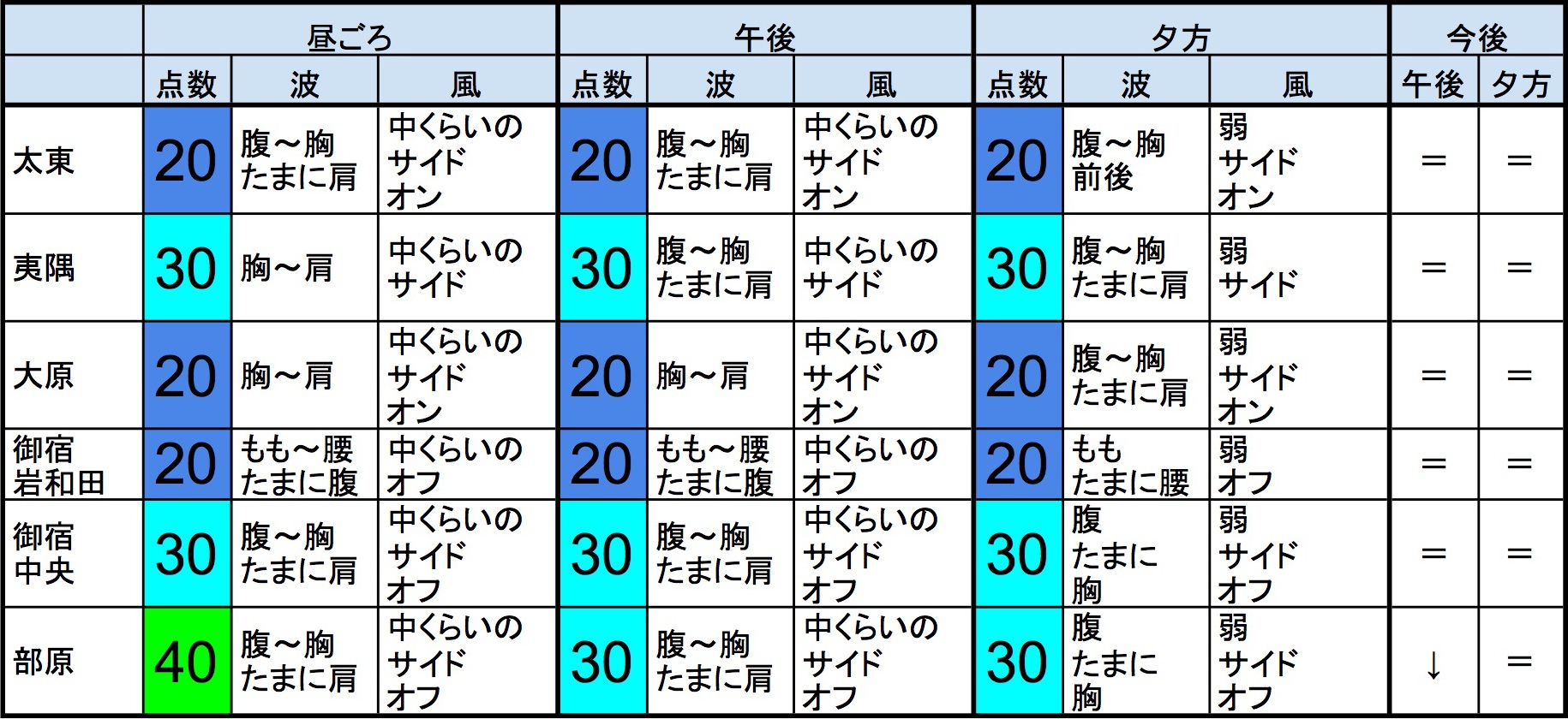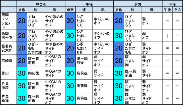 【千葉北 南部エリア】-・千葉北 南部エリアは腹〜胸〜肩くらいの波、安定しない風、それほど良くなくても場所を選んで多少できそうなコンディションで、午後から夕方にかけてもコンディションはそのままキープしそうです。-