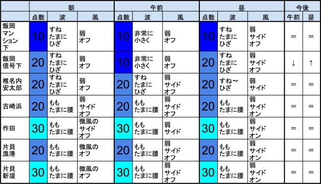 【千葉北 北部エリア】-“・千葉北 北部エリアはもも〜腰くらいの波、弱めのオフショアベースの風のスタート、プアなコンディションで、午前から昼にかけても状況はあまり変わらなさそうです。午後から夕方にかけてもコンディションはあまり変わらなさそうです。