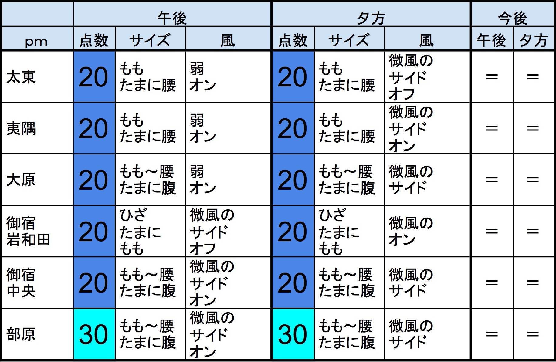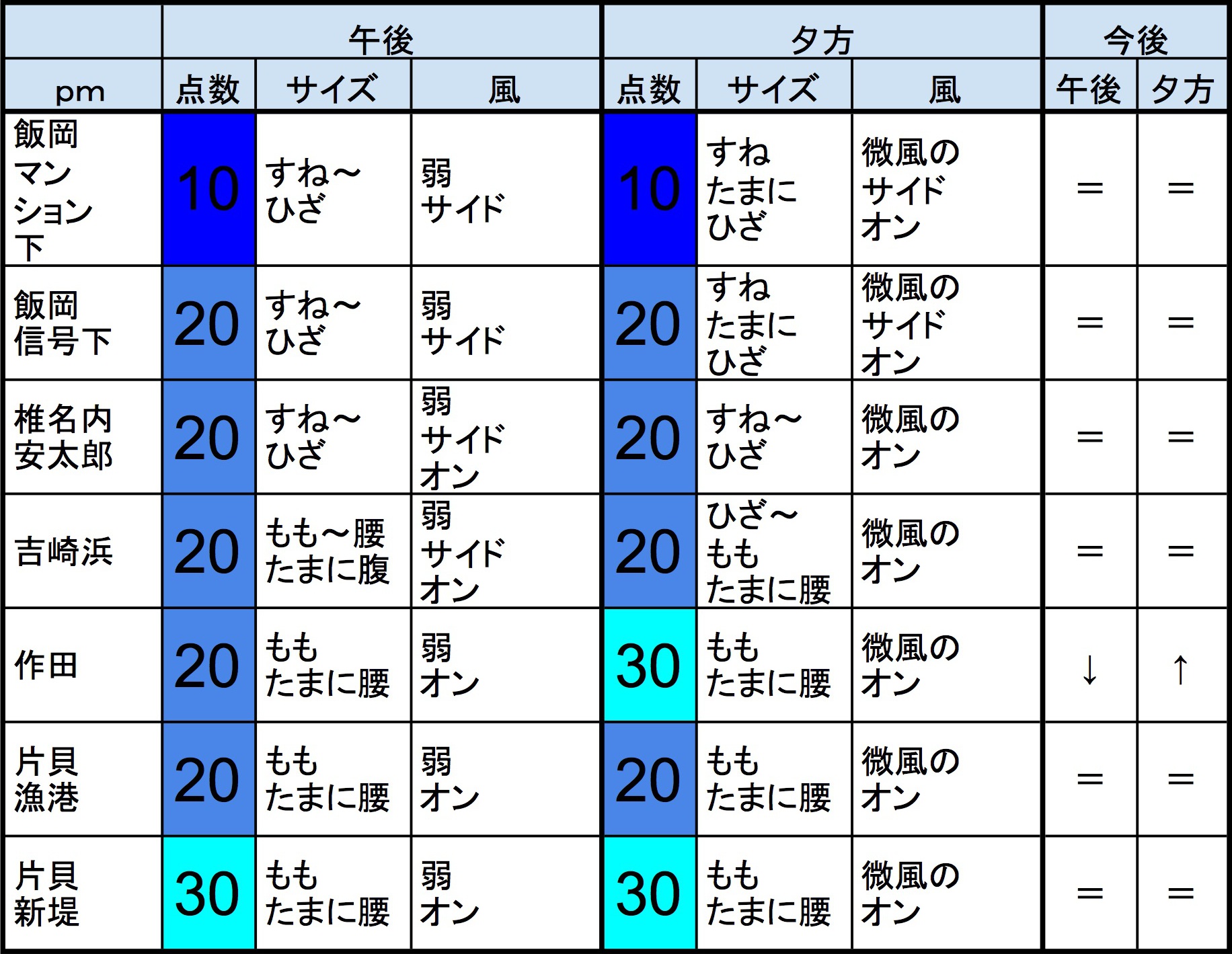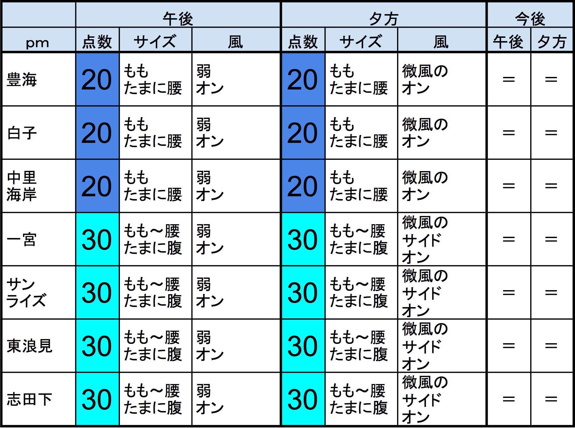 ・早めなら、作田、片貝新堤、一宮、サンライズ、東浪見、志田下、御宿中央、部原、あたり、後半なら、作田、片貝新堤、一宮、サンライズ、東浪見、志田下、部原、あたりが狙い目でしょうか。-“