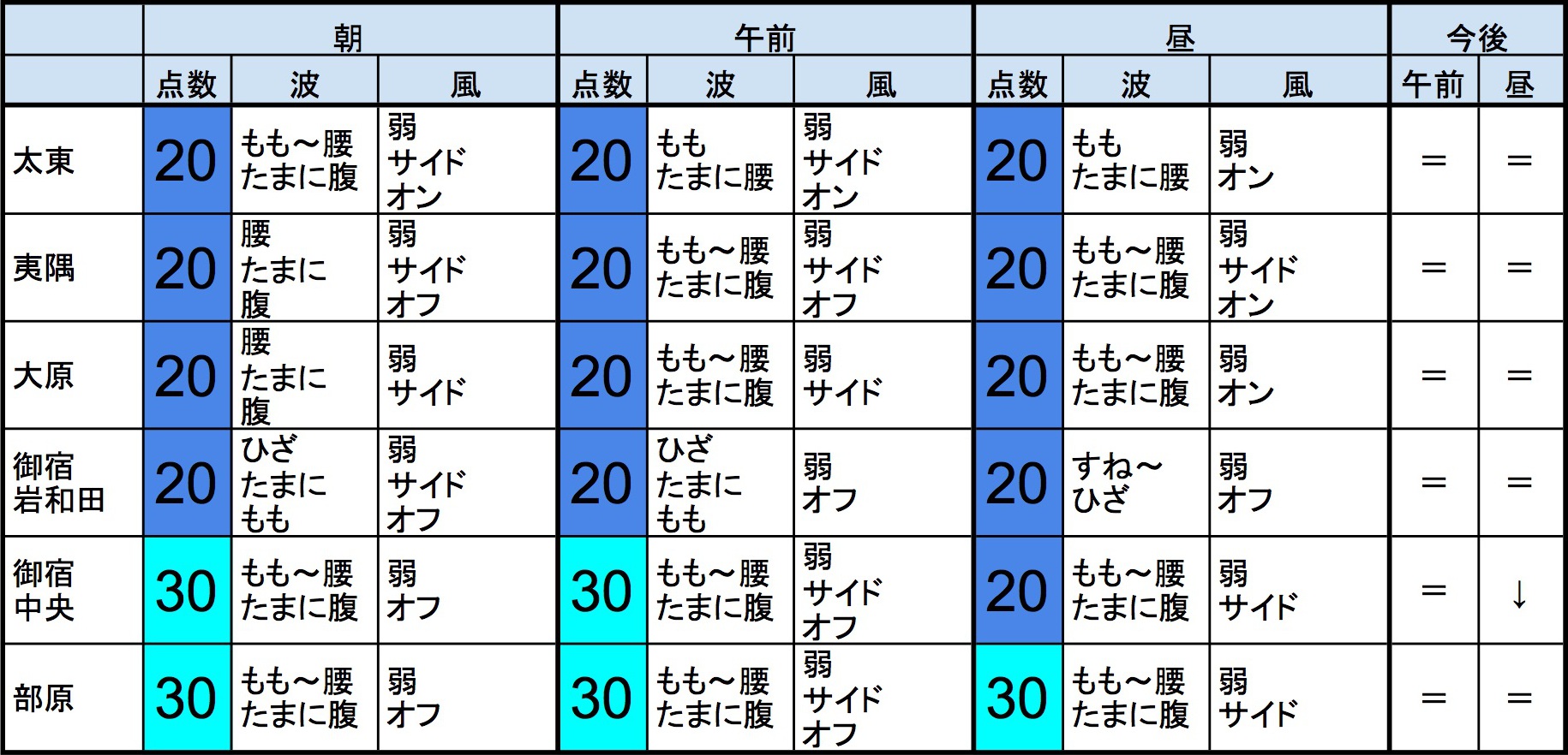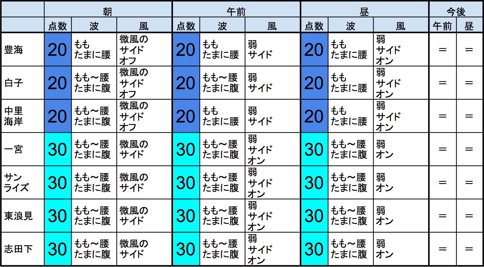 【千葉北 中央エリア】-・千葉北 中央エリアはもも〜腰〜腹くらいの波、弱めのオフショアベースの風のスタート、それほど良くなくても場所を選んで多少できそうなコンディションで、午前から昼にかけてもコンディションはそのままキープしそうです。午後から夕方にかけてもコンディションはそのままキープしそうです。-