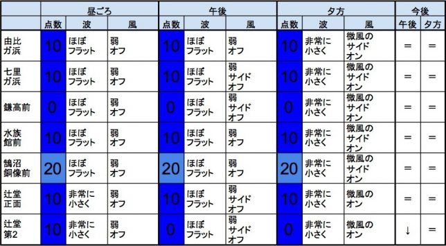 【湘南西エリア】-・湘南 西エリアは非常に小さく、弱めのオフショアベースの風、プアなコンディションで、午後から夕方にかけても状況はあまり変わらなさそうです。-