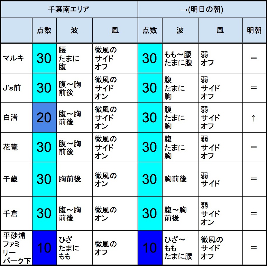 10月16日(火)最終〜明日10月17日(水)朝の千葉南の波 2018年10月16日 / U / コメントする 【千葉南エリア】-“・明朝の千葉南エリアは腹〜胸くらいの波、弱めのオフショアベースの風、多少できそうなコンディションでのスタートとなりそうです。- ・マルキ、J’s前、白渚、花篭、千歳、千倉、周辺あたりでは、多少期待できそうでしょうか。”