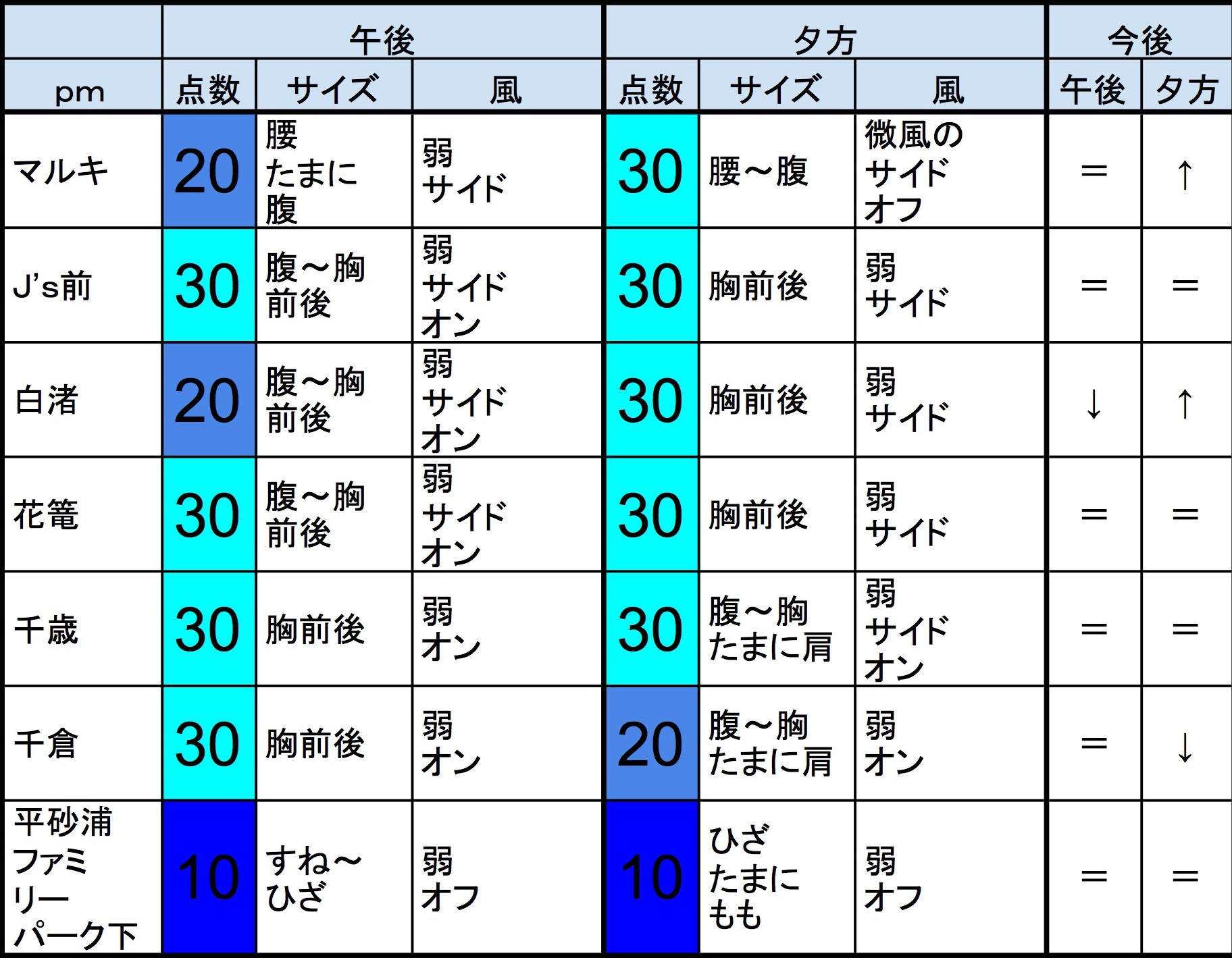 ・早めなら、J’s前、白渚、花篭、千歳、あたり、後半なら、J’s前、白渚、花篭、千歳、千倉、あたりが狙い目でしょうか。”
