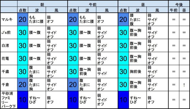 【千葉南エリア】-“・千葉南エリアは腰〜腹くらいの波、弱めのオフショアベースの風のスタート、それほど良くなくても場所を選んで多少できそうなコンディションで、午前から昼にかけてもコンディションはそのままキープしそうです。午後から夕方にかけてもコンディションはそのままキープしそうです。-