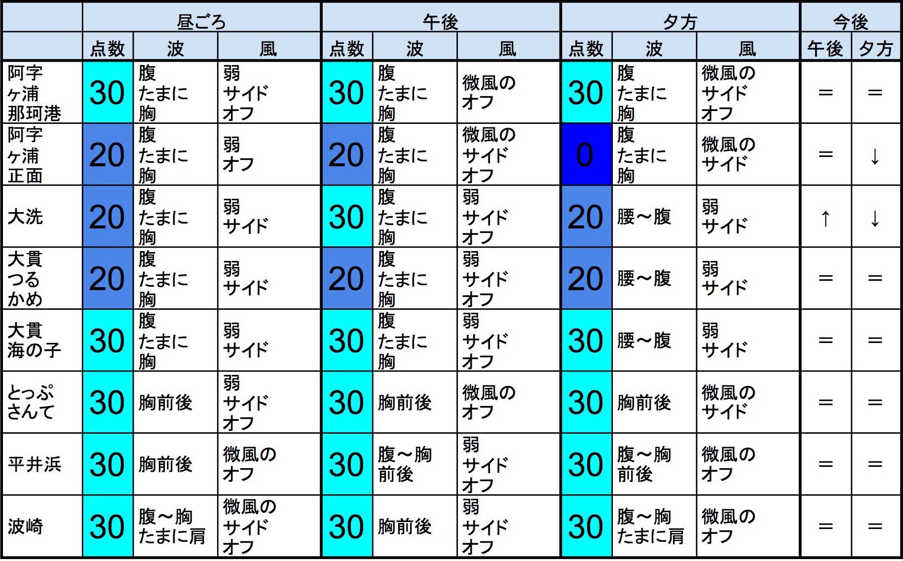 【茨城エリア】-“・茨城エリアは腹〜胸くらいの波、弱めのオフショアベースの風、それほど良くなくても場所を選んで多少できそうなコンディションで、午後から夕方にかけてもコンディションはそのままキープしそうです。