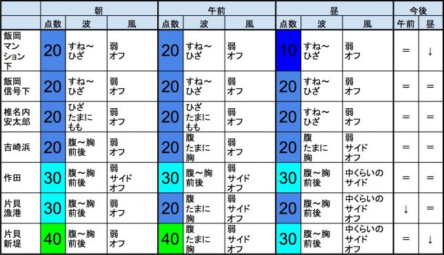 【千葉北 北部エリア】-“・千葉北 北部エリアは腹〜胸前後くらいの波、弱めのオフショアベースの風のスタート、それほど良くなくても場所を選んで多少できそうなコンディションで、午前から昼にかけてもコンディションはそのままキープしそうです。午後から夕方にかけてもコンディションはそのままキープしそうです。