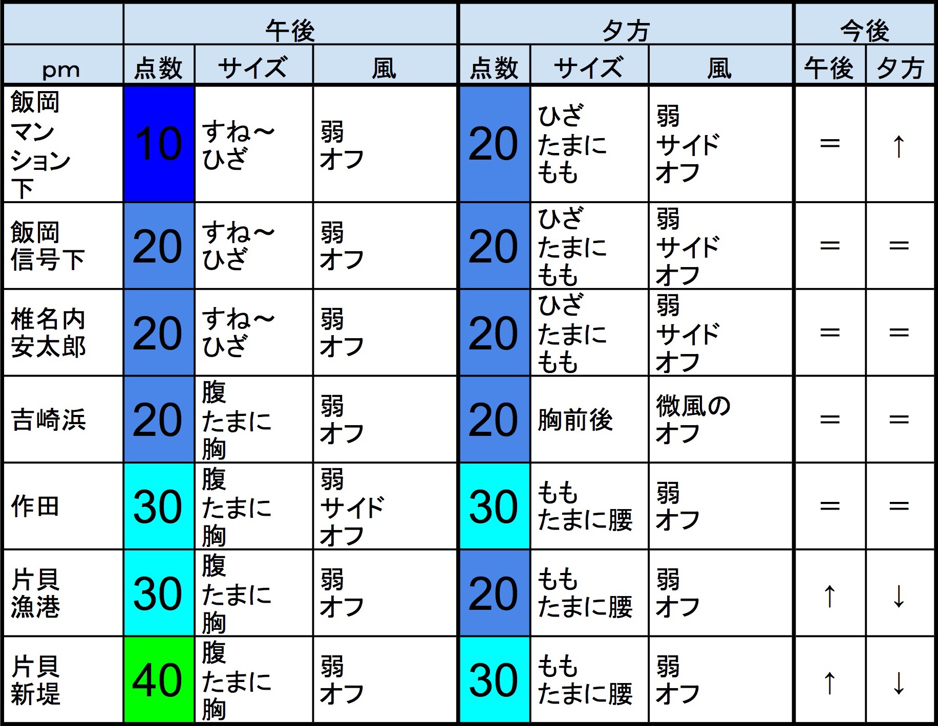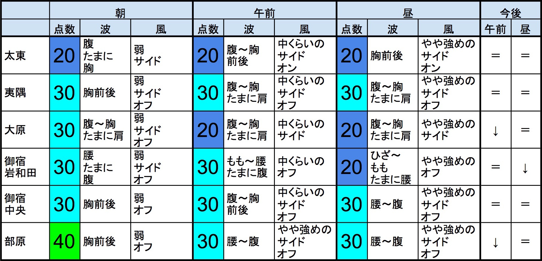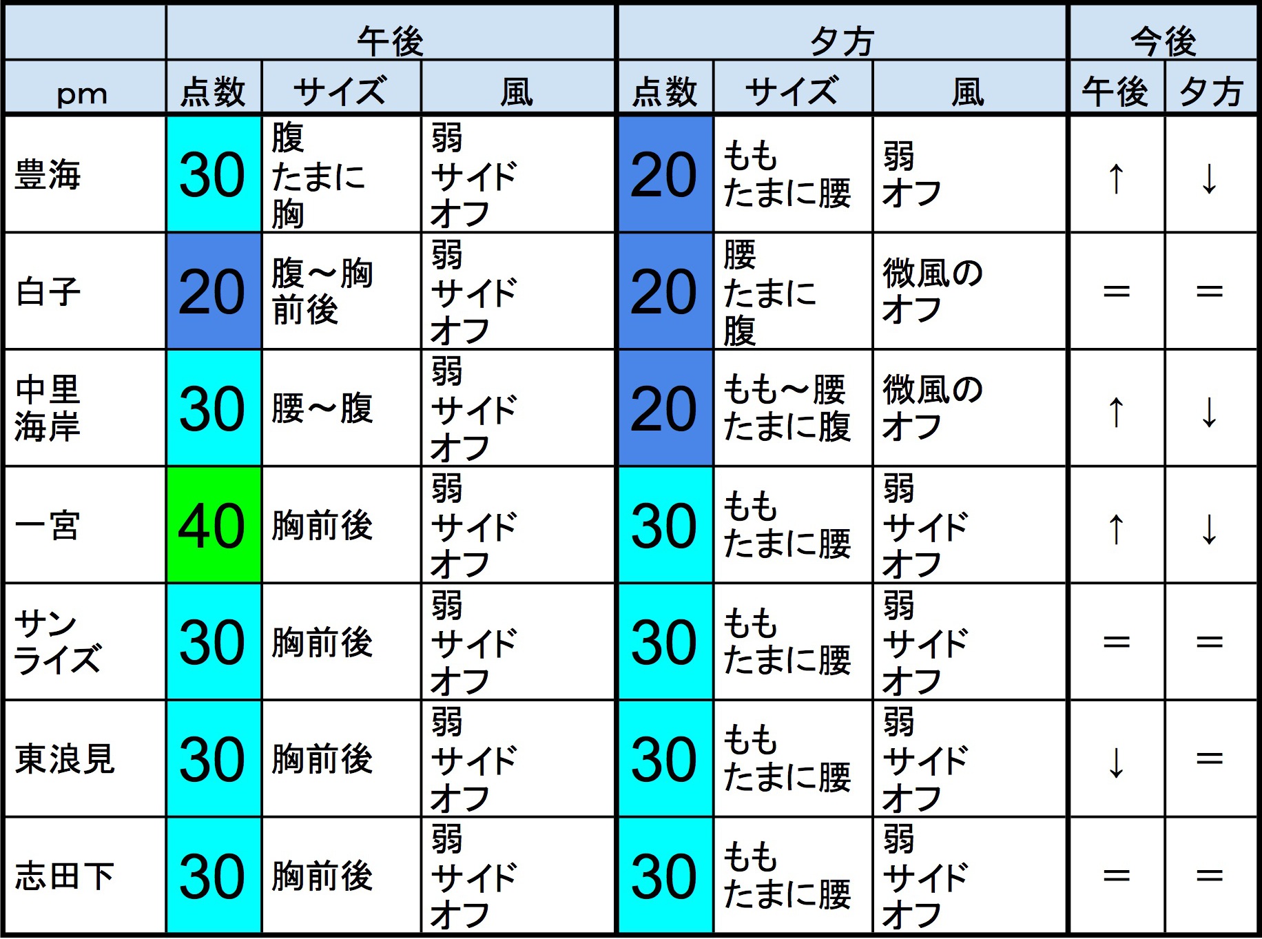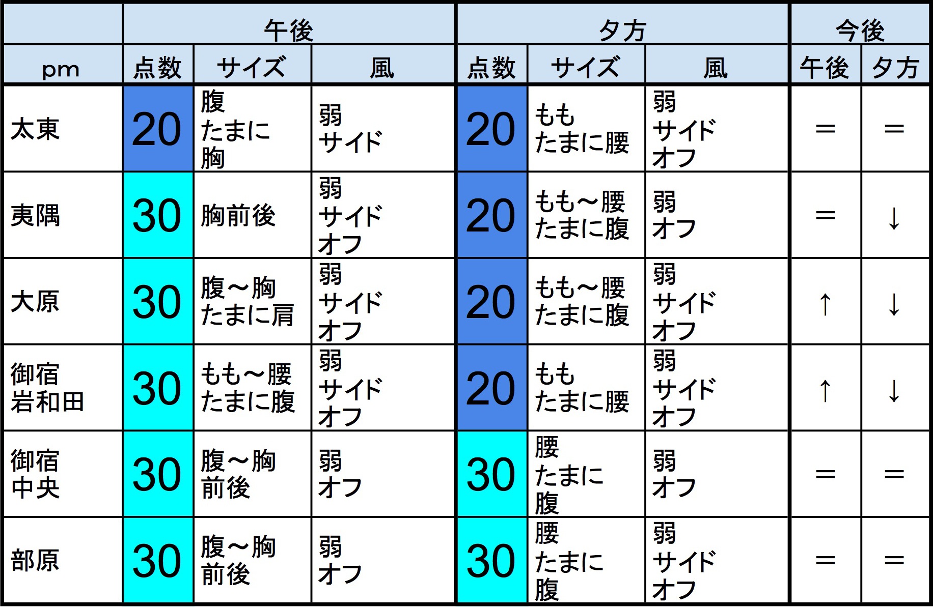 ・早めなら、片貝新堤、一宮、サンライズ、東浪見、志田下、部原、作田、片貝漁港、豊海、中里海岸、夷隅、大原、御宿岩和田、御宿中央、あたり、後半なら、片貝新堤、夷隅、御宿中央、部原、作田、一宮、サンライズ、東浪見、志田下、あたりが狙い目でしょうか。-“