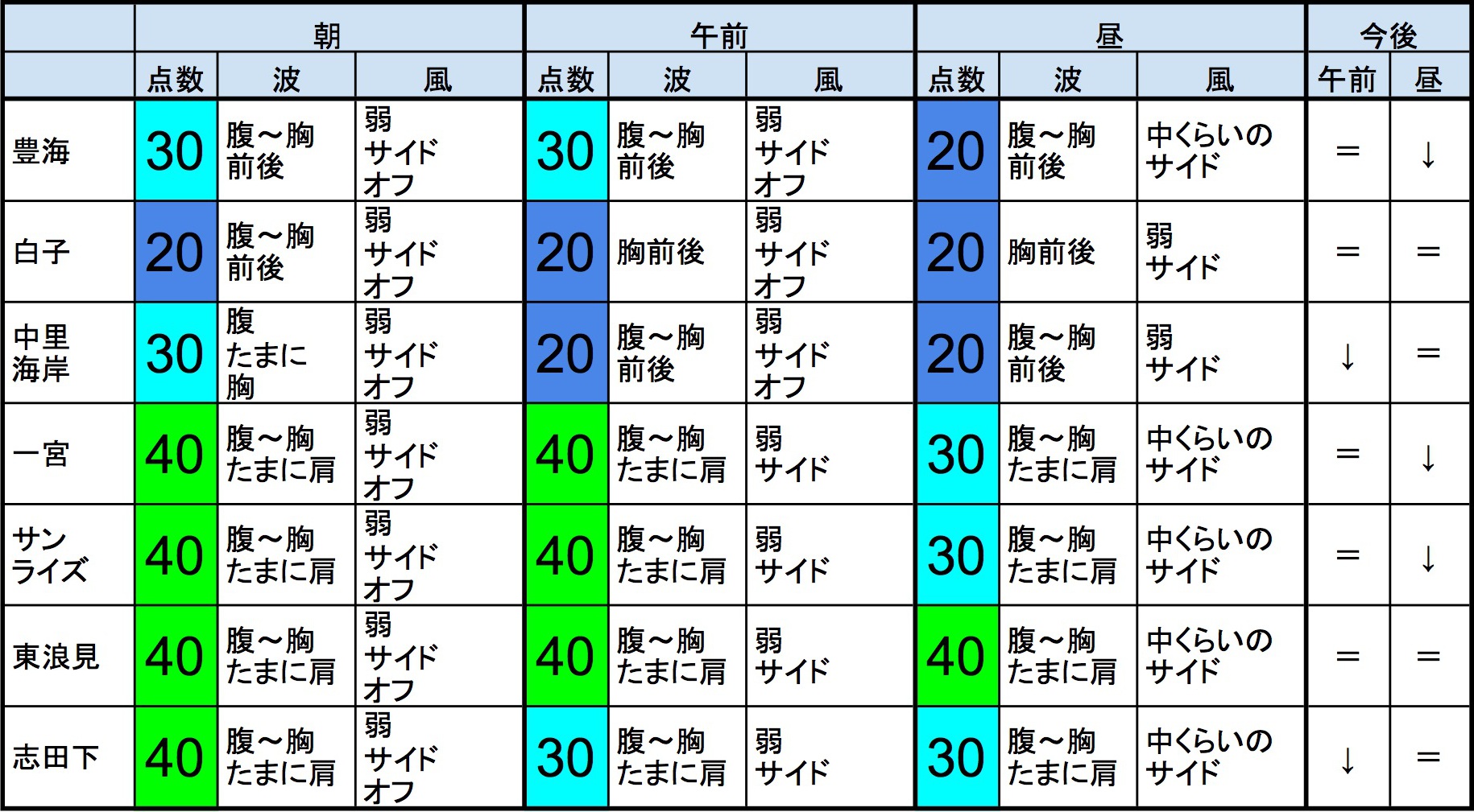 【千葉北 南部エリア】-・千葉北 南部エリアは胸前後くらいの波、弱めのオフショアベースの風のスタート、多少できそうなコンディションで、午前から昼にかけてもコンディションはそのままキープしそうです。午後から夕方にかけてはコンディションは多少落ちそうです。-