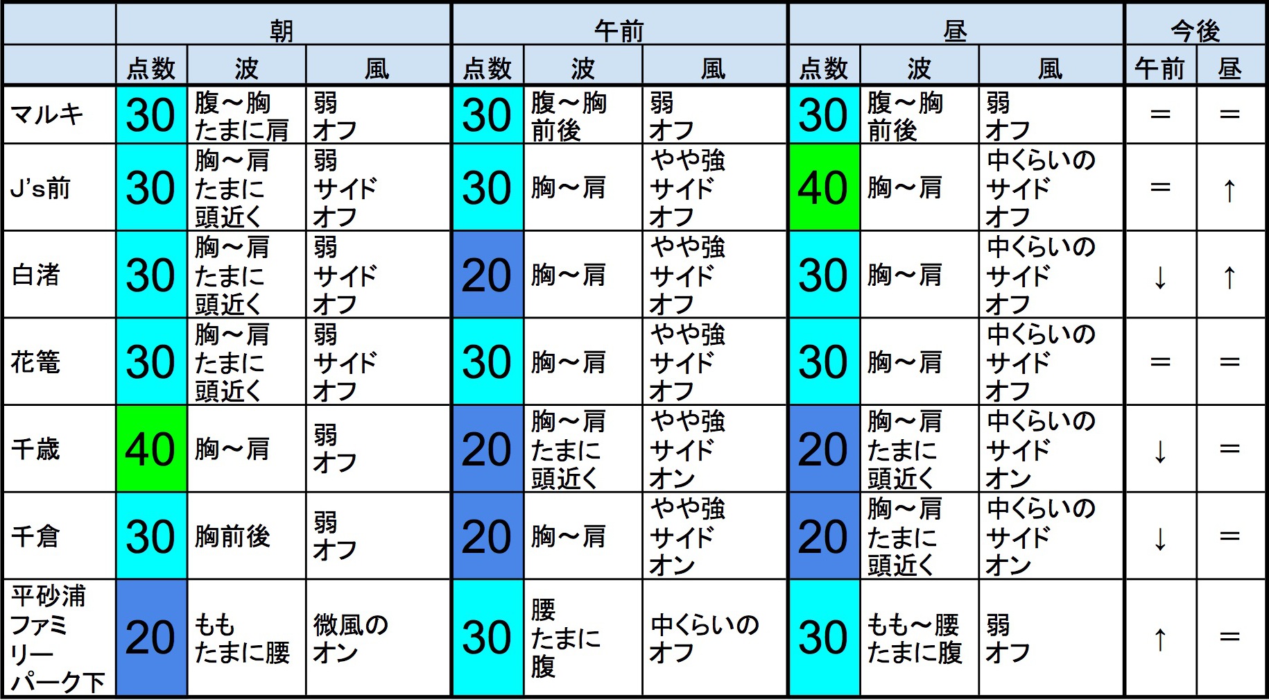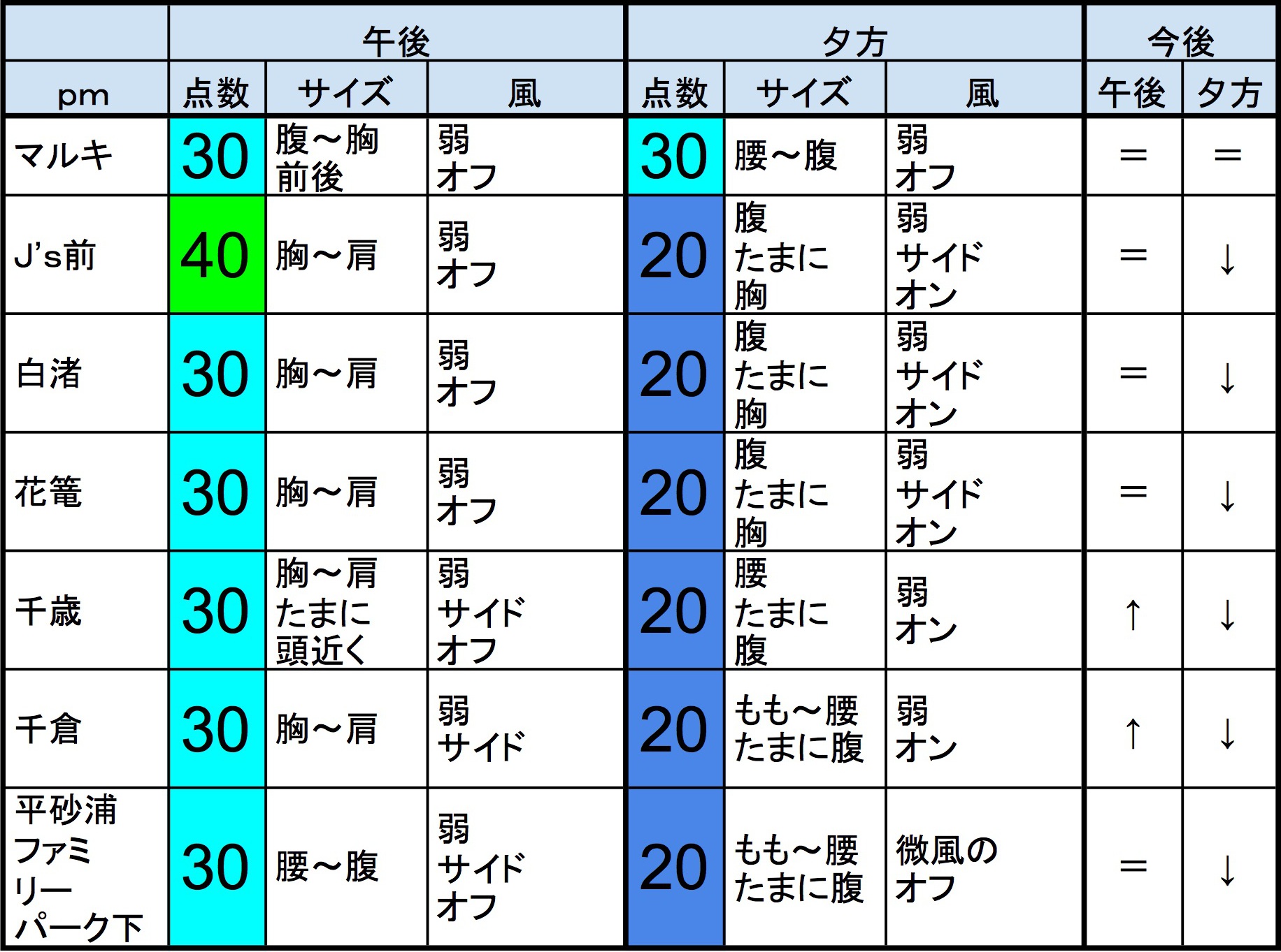 ・早めなら、千歳、マルキ、J’s前、白渚、花篭、千倉、あたり、後半なら、マルキ、白渚、花篭、平砂浦ファミリーパーク下、あたりが狙い目でしょうか。”