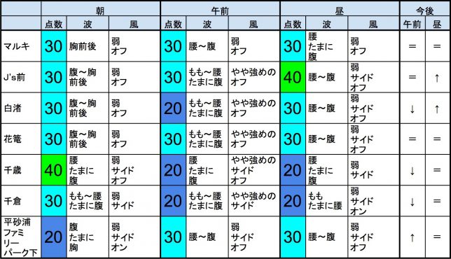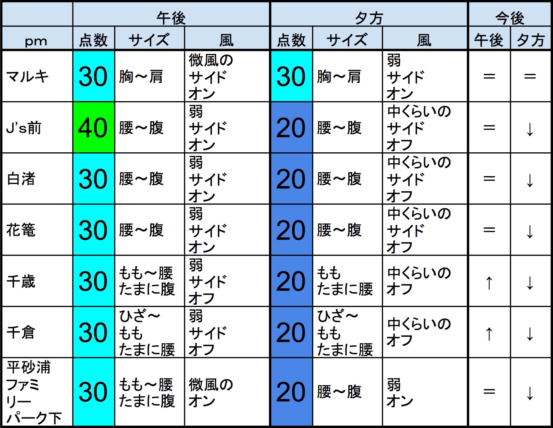 ・早めなら、千歳、マルキ、J’s前、白渚、花篭、千倉、あたり、後半なら、マルキ、白渚、花篭、平砂浦ファミリーパーク下、あたりが狙い目でしょうか。”