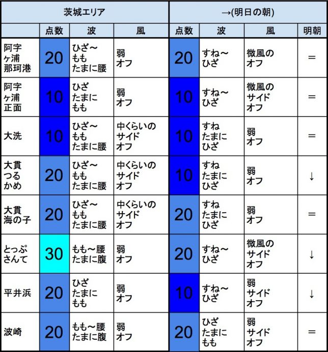 【茨城エリア】-“・明朝の茨城エリアはすね〜ひざくらいの波、弱めのオフショアベースの風、プアなコンディションでのスタートとなりそうです。”