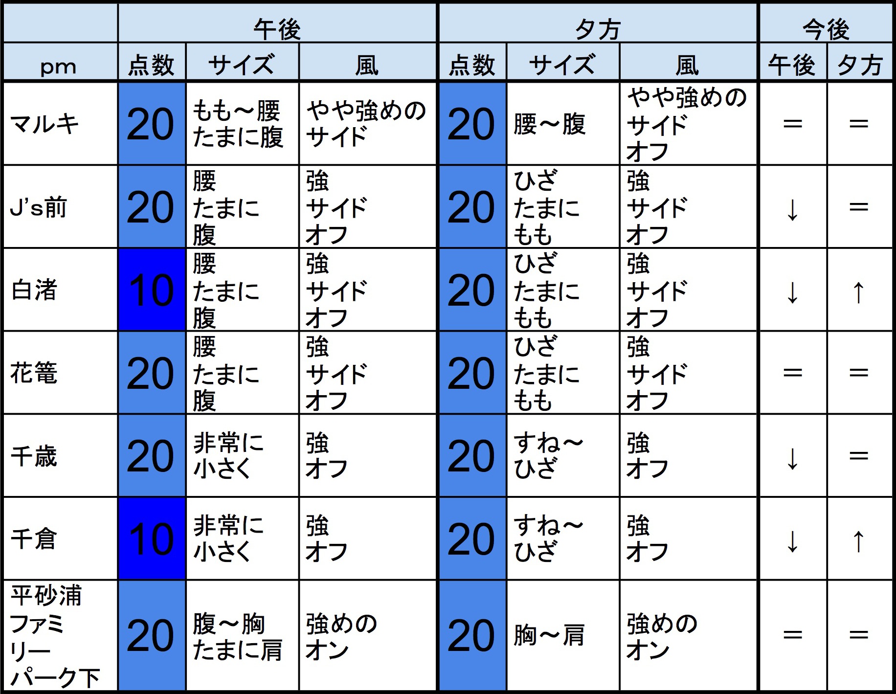 ・早めなら、マルキ、J’s前、花篭、千歳、平砂浦ファミリーパーク下、あたり、後半なら、J’s前、千歳、あたりが狙い目でしょうか。”