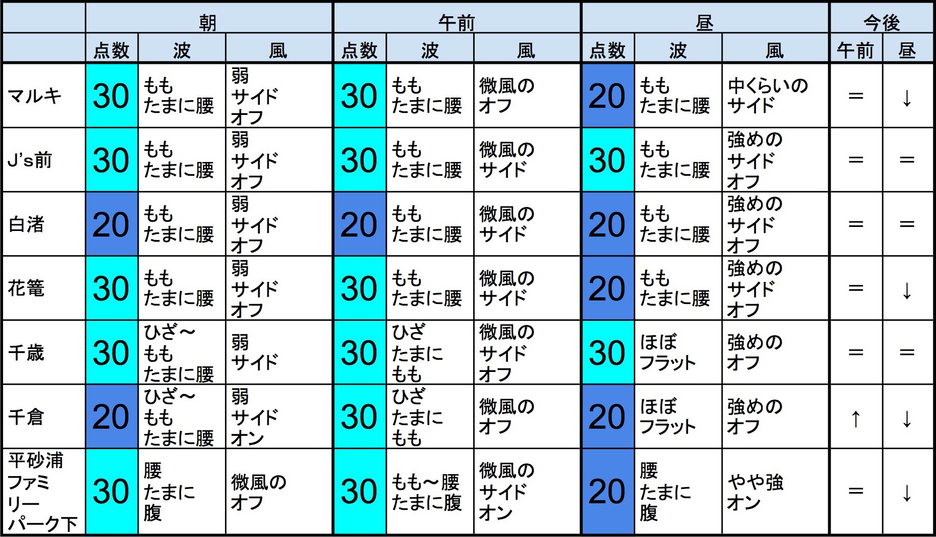 【千葉南エリア】-“・千葉南エリアはもも〜腰くらいの波、弱めのオフショアベースの風のスタート、多少できそうなコンディションで、午前から昼にかけてもコンディションはそのままキープしそうです。午後から夕方にかけてはコンディションは多少落ちそうです。-