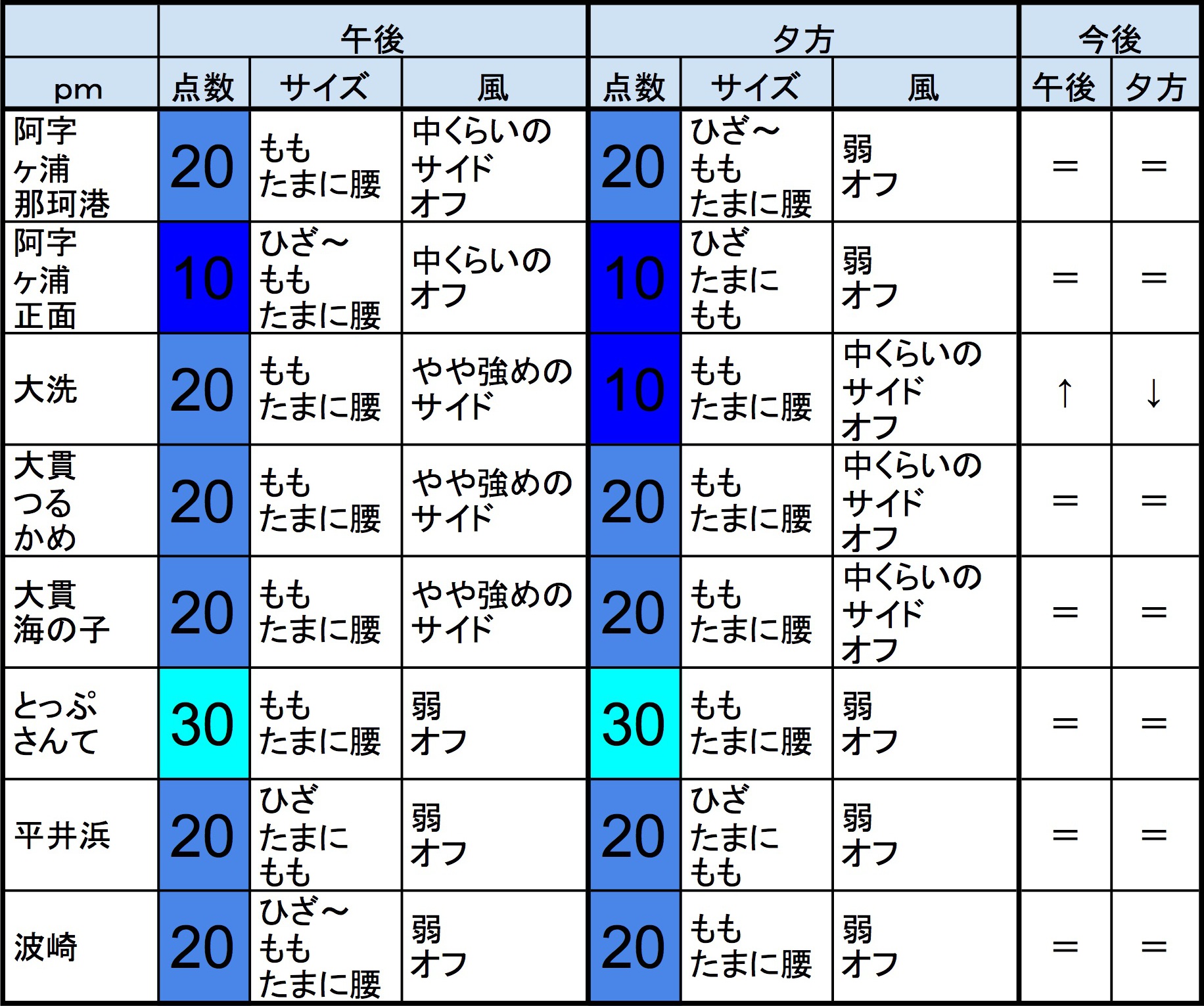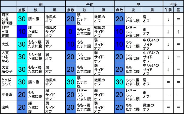 【茨城エリア】-“・茨城エリアはもも〜腰〜腹くらいの波、弱めのオフショアベースの風のスタート、それほど良くなくても場所を選んで多少できそうなコンディションで、午前から昼にかけてコンディションは下向きそうです。午後から夕方にかけてもコンディションはそのままキープしそうです。