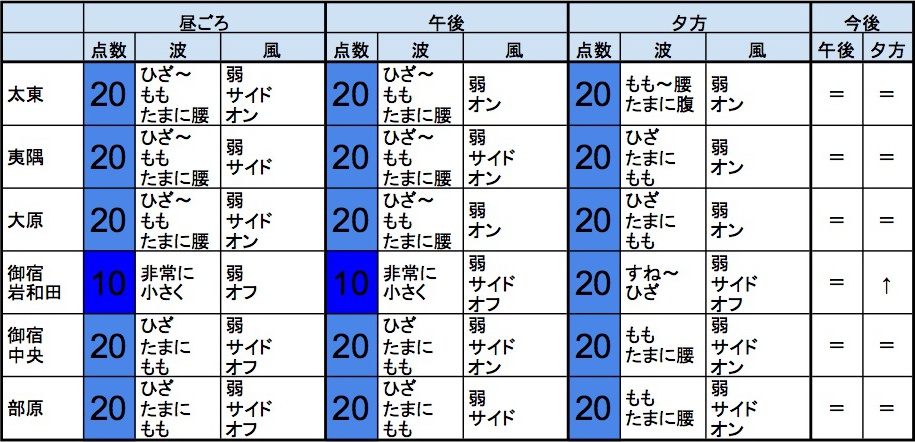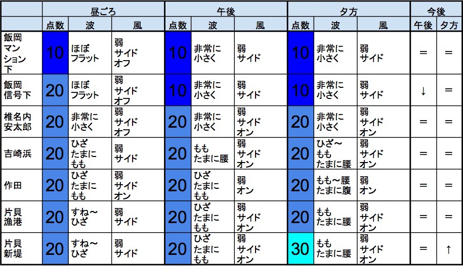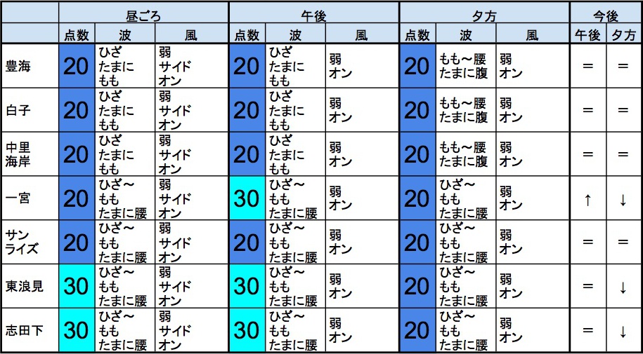 【千葉北 南部エリア】-・千葉北 南部エリアはひざ〜もも〜腰くらいの波、弱めの風、プアなコンディションで、午後から夕方にかけても状況はあまり変わらなさそうです。-