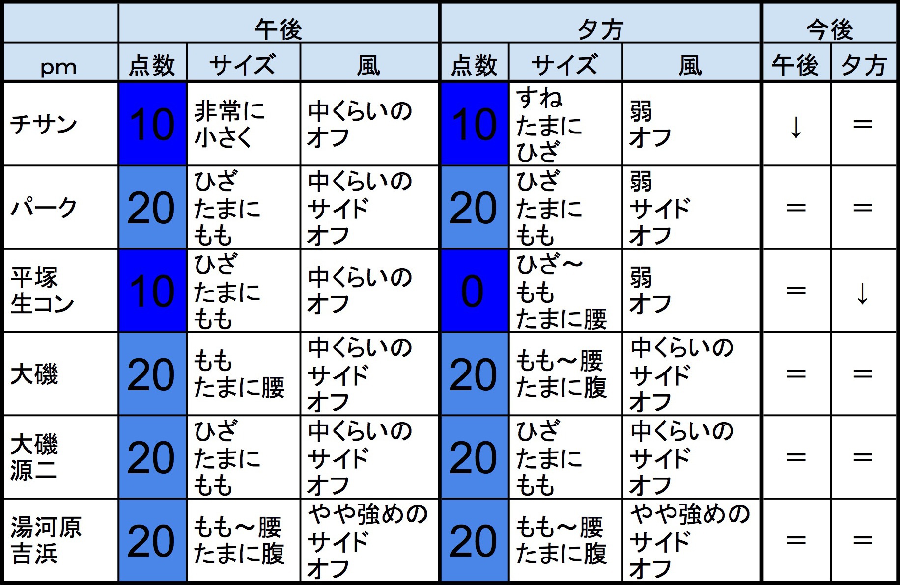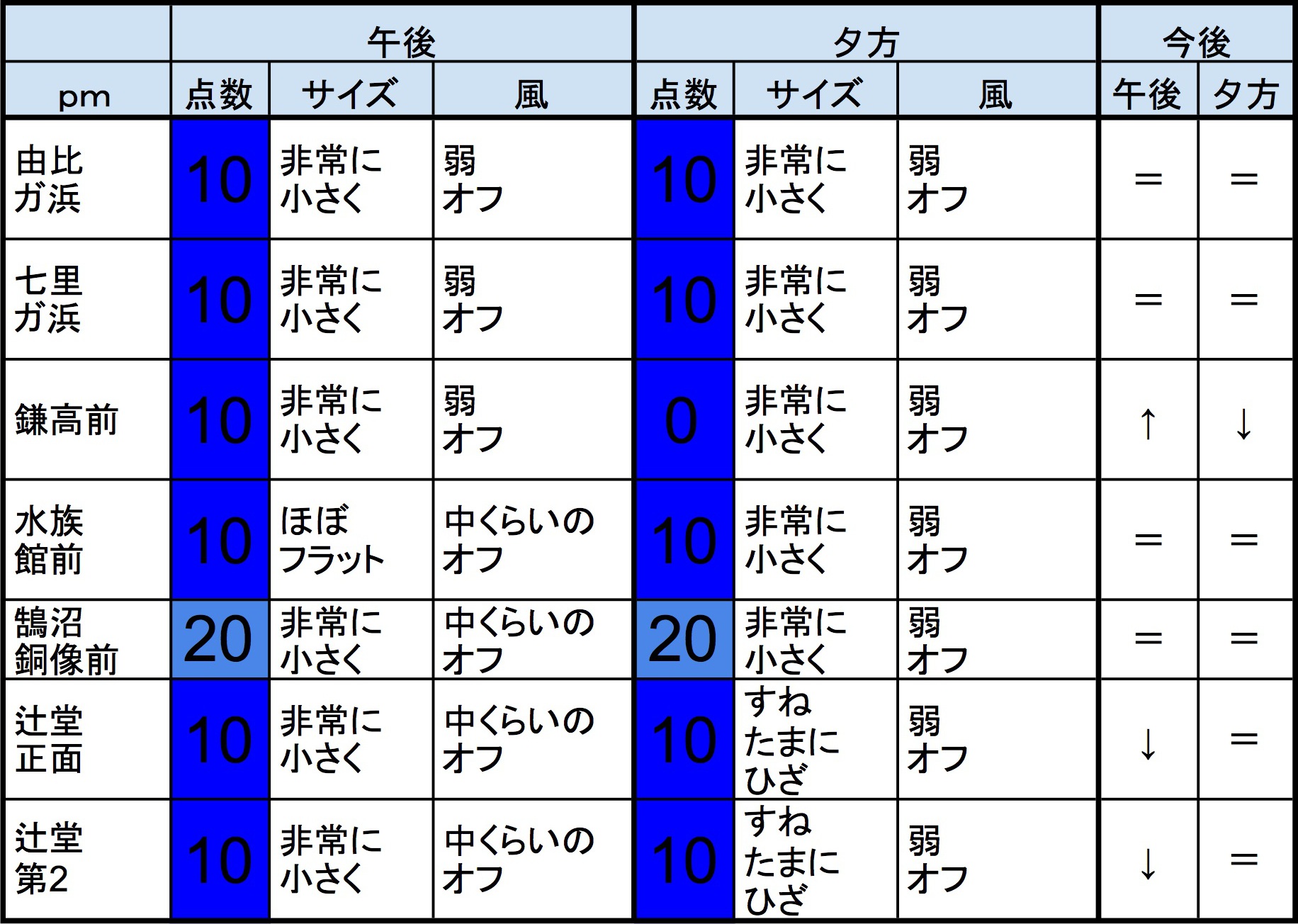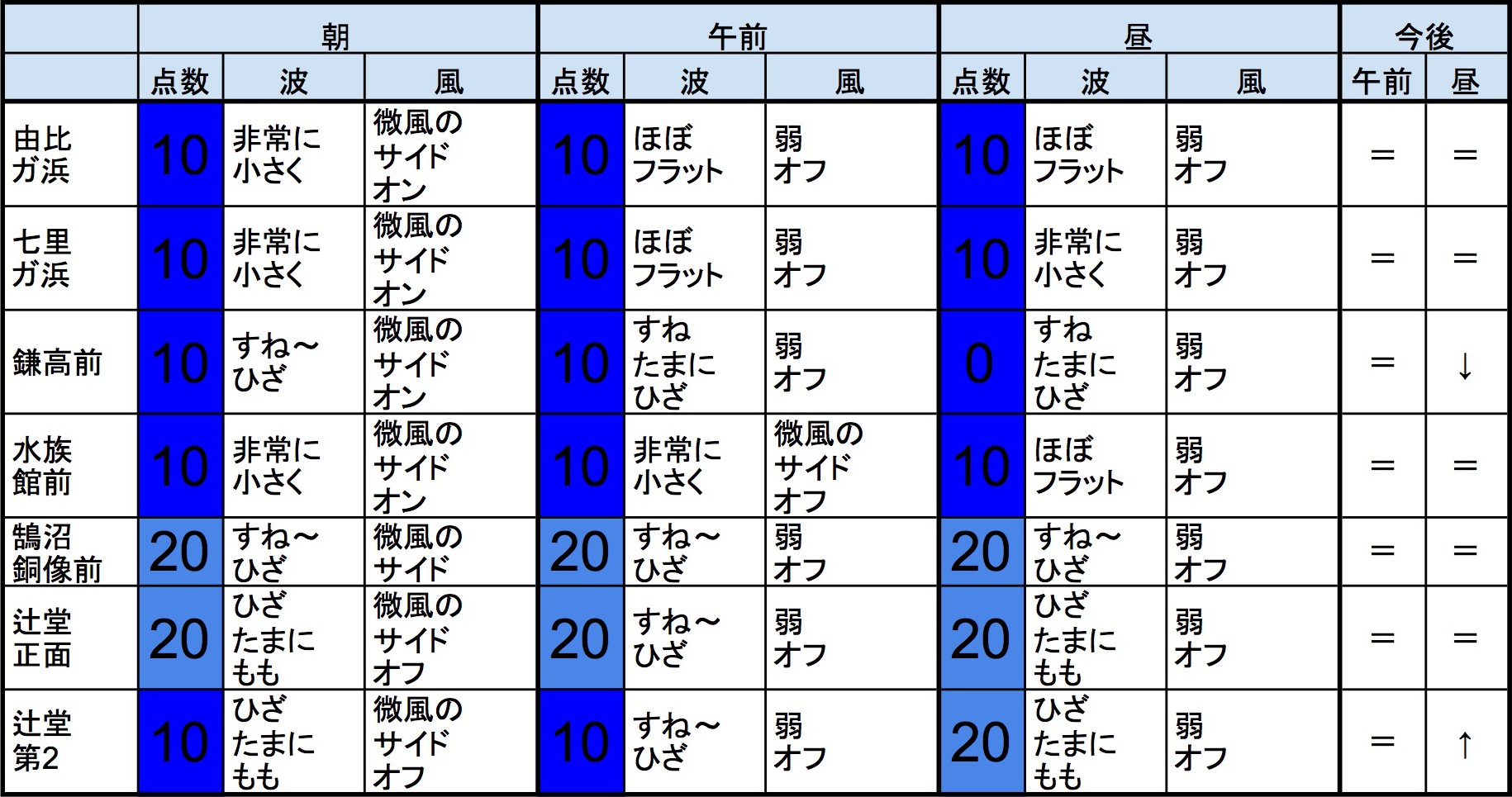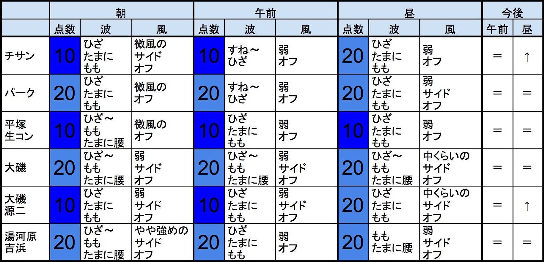 12月22日(土)朝の湘南の波 2018年12月22日 / U / コメントする 【湘南東エリア】-“・湘南 東エリアは非常に小さく、弱めの風のスタート、プアなコンディションで、午前から昼にかけても状況はあまり変わらなさそうです。午後から夕方にかけてもコンディションはあまり変わらなさそうです。” 【湘南西エリア】-・湘南 西エリアはひざ〜ももくらいの波、弱めのオフショアベースの風のスタート、プアなコンディションで、午前から昼にかけても状況はあまり変わらなさそうです。午後から夕方にかけてもコンディションはあまり変わらなさそうです。-