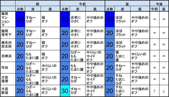 【千葉北 北部エリア】-“・千葉北 北部エリアはすね〜ひざくらいの波、オフショアベースの風のスタート、プアなコンディションで、午前から昼にかけても状況はあまり変わらなさそうです。午後から夕方にかけてもコンディションはあまり変わらなさそうです。