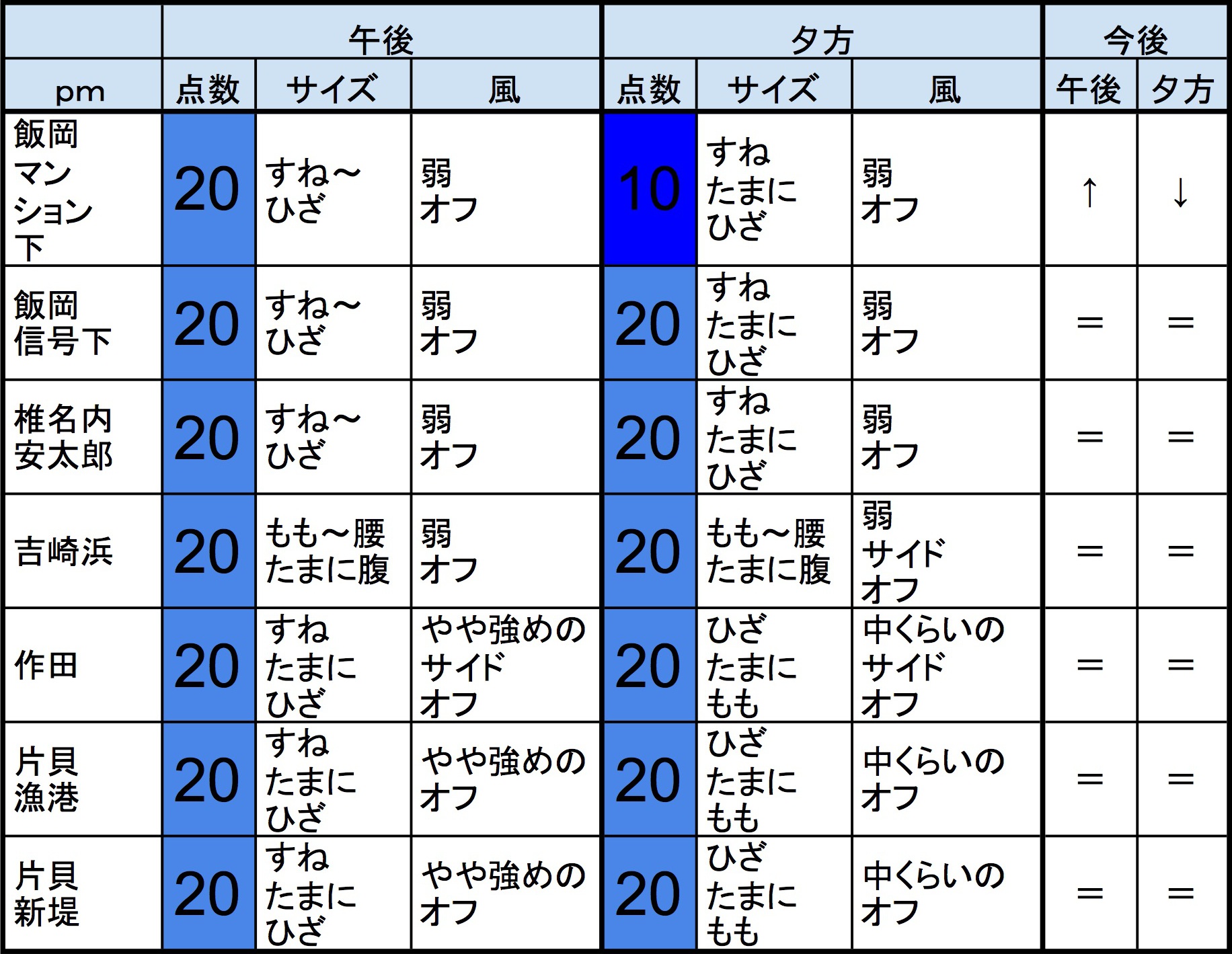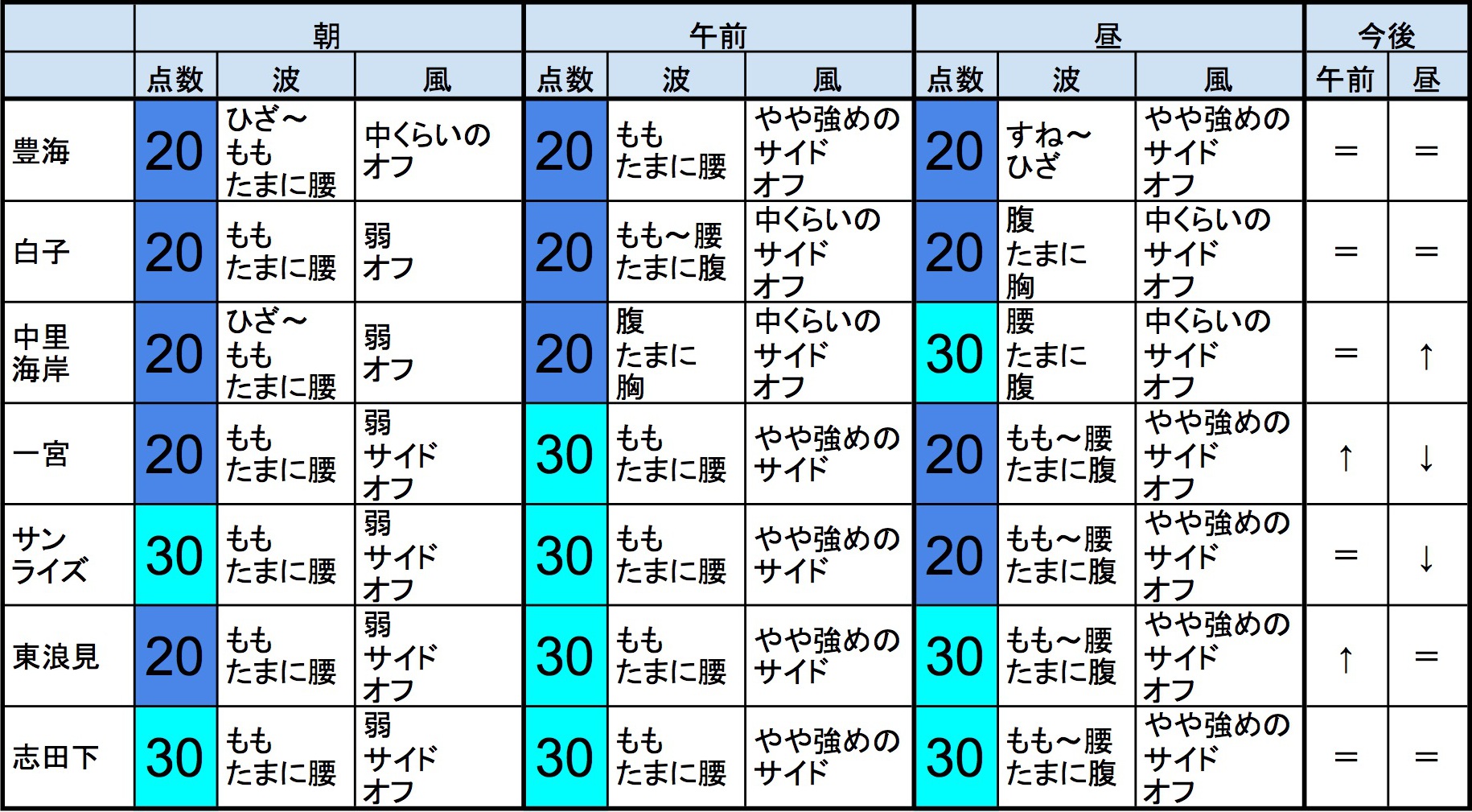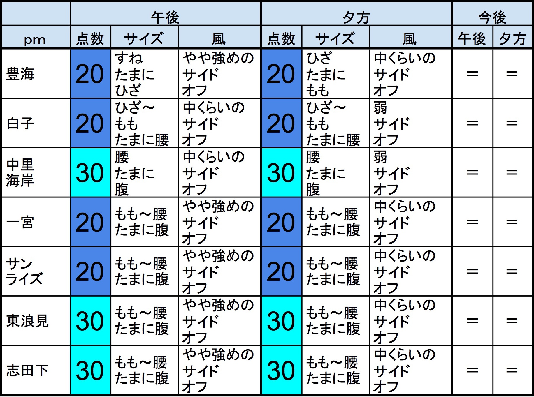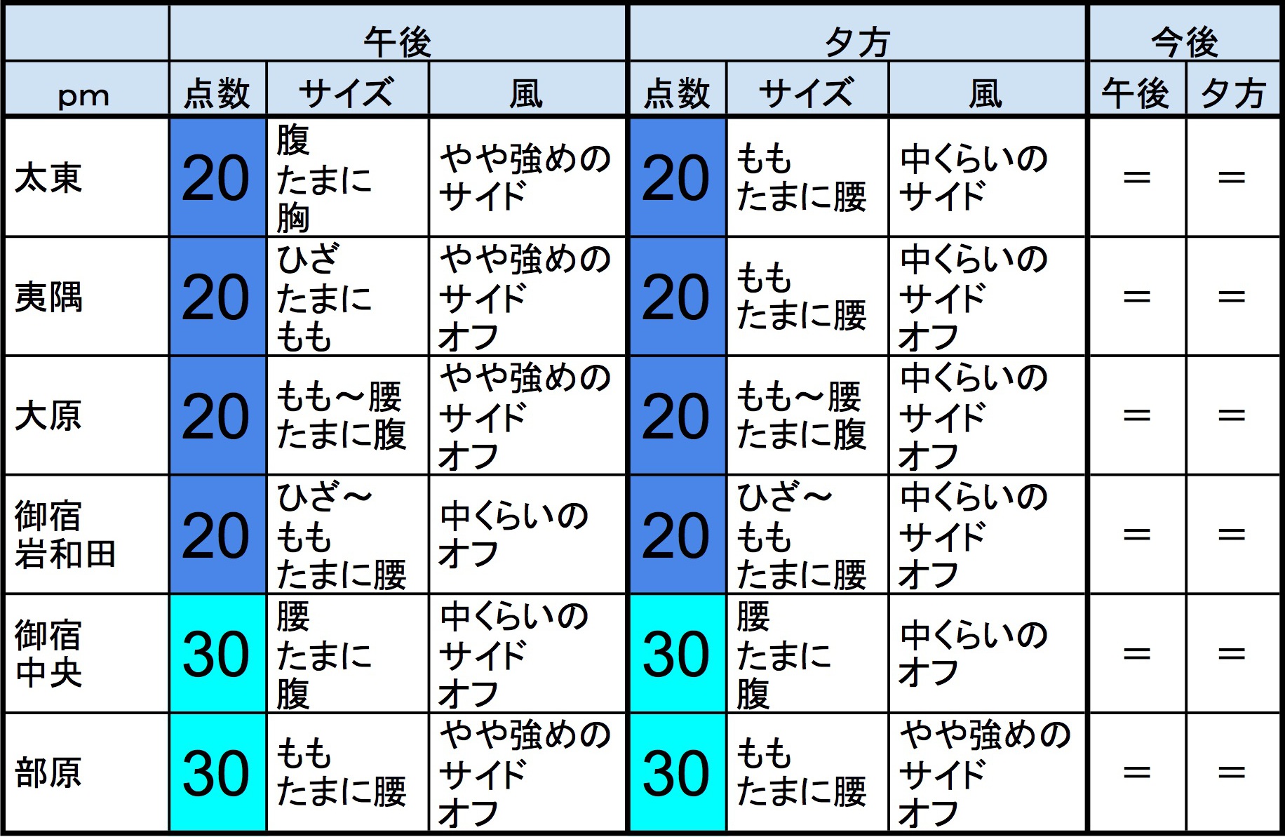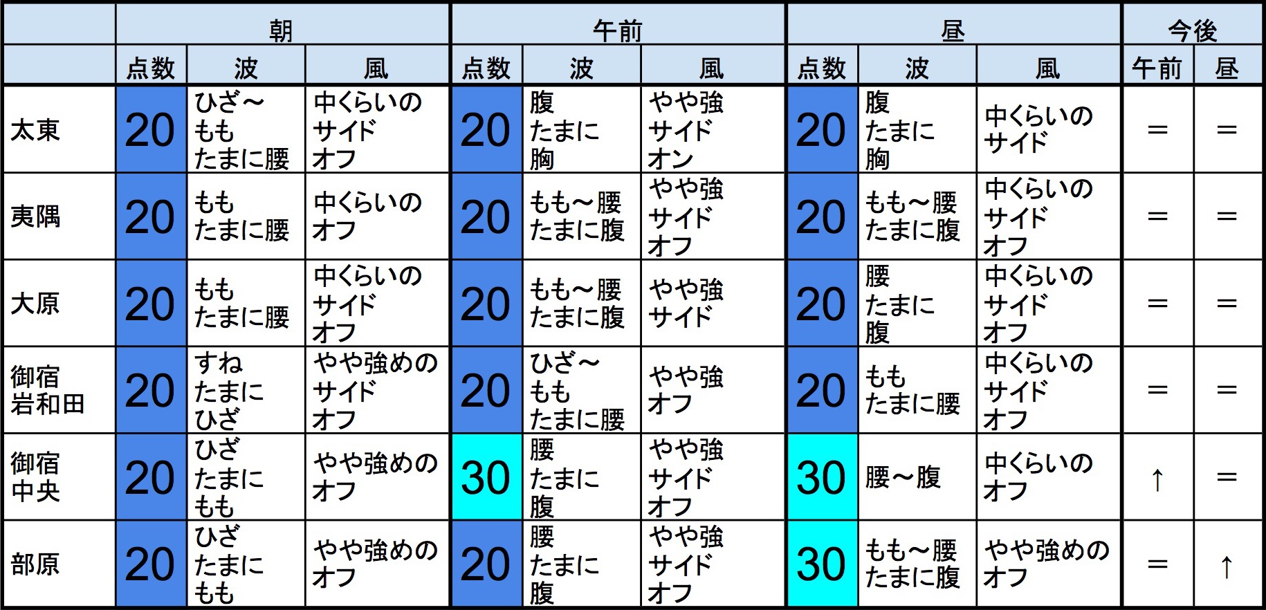 ・早めなら、サンライズ、志田下、あたり、後半なら、中里海岸、東浪見、志田下、御宿中央、部原、あたりが狙い目でしょうか。-少し待ってみると、さらにコンディションが上向いてくる可能性もあると思います。”