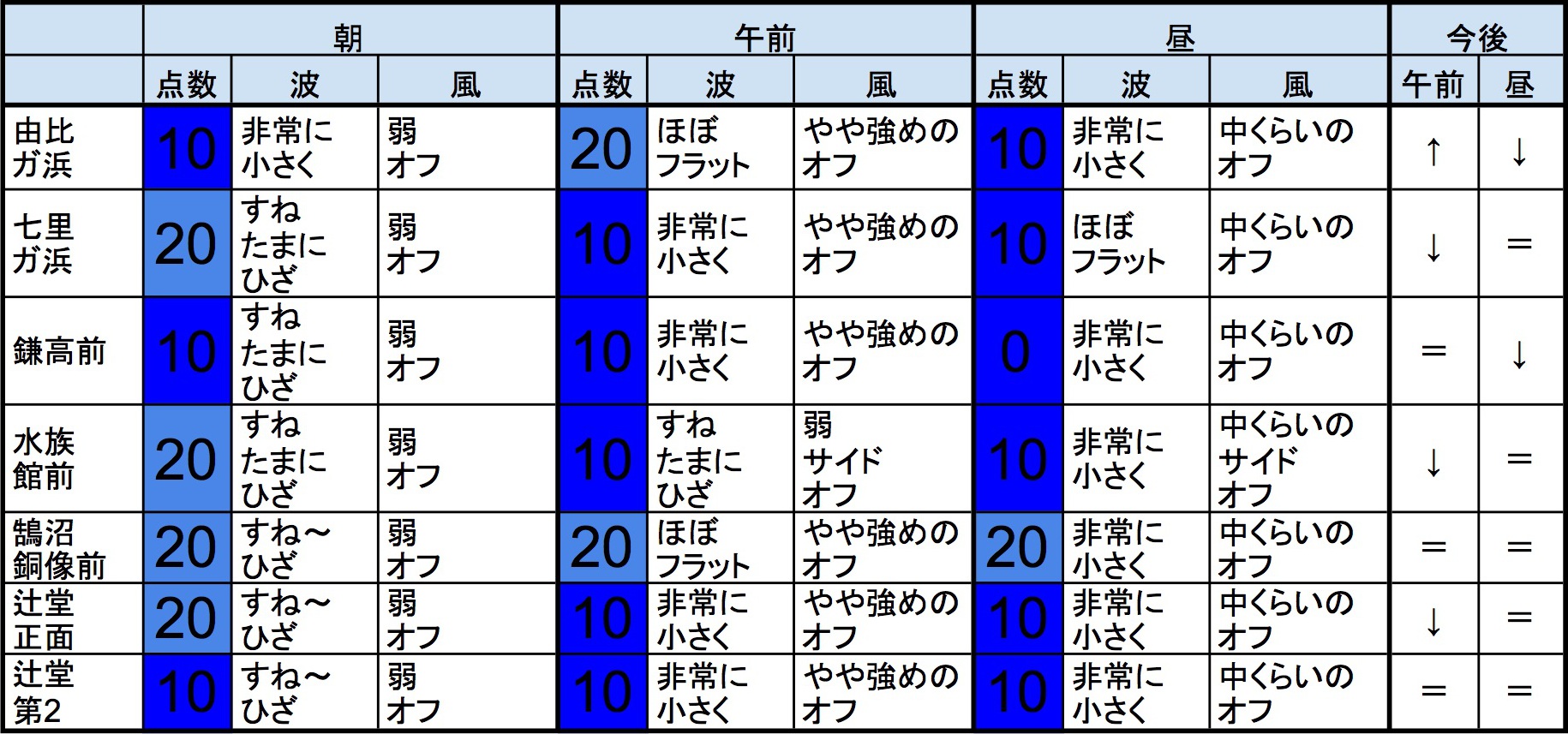 【湘南東エリア】-“・湘南 東エリアはすね〜ひざくらいの波、弱めのオフショアベースの風のスタート、プアなコンディションで、午前から昼にかけても状況はあまり変わらなさそうです。午後から夕方にかけてはコンディションはあまり期待できなさそうです。