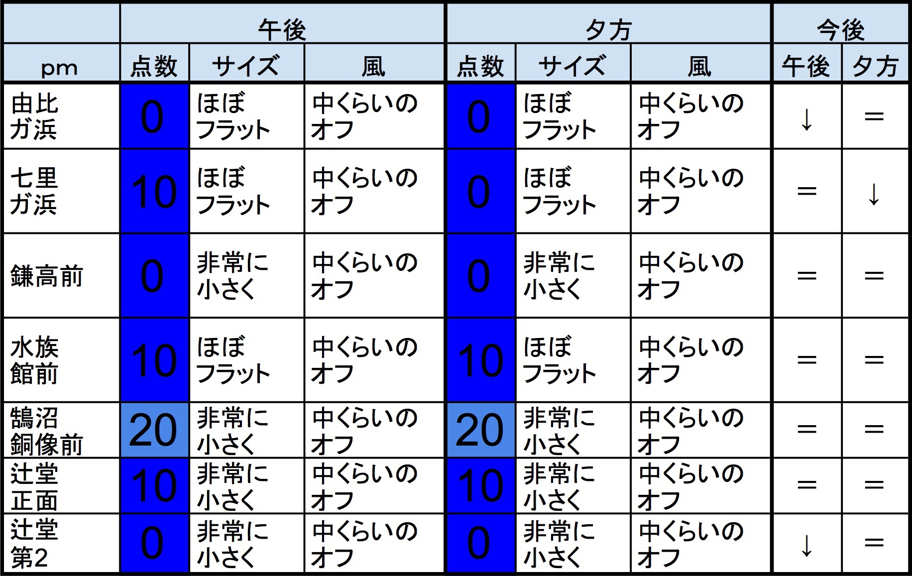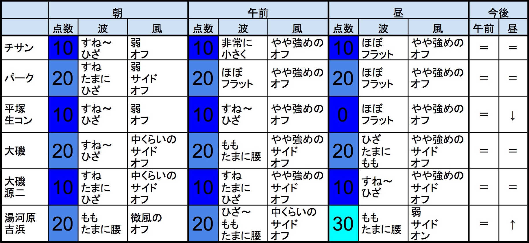 【湘南西エリア】-・湘南 西エリアはすね〜ひざくらいの波、オフショアベースの風のスタート、プアなコンディションで、午前から昼にかけても状況はあまり変わらなさそうです。午後から夕方にかけてはコンディションはあまり期待できなさそうです。-