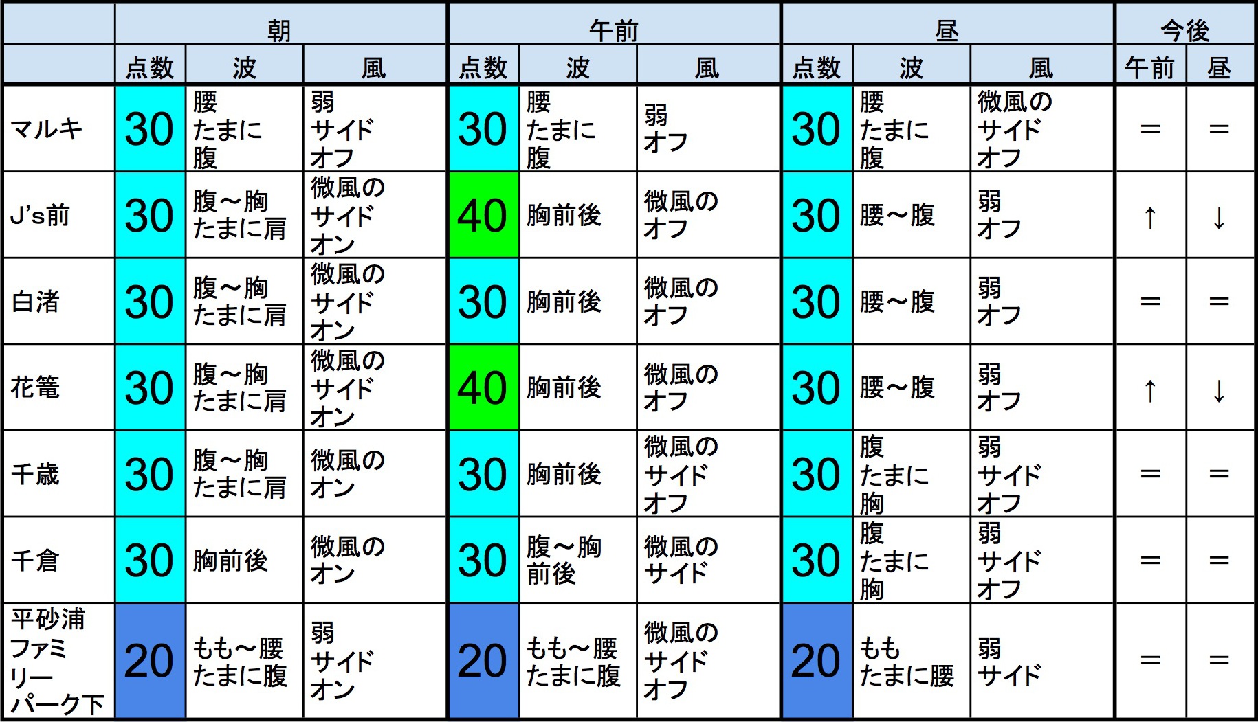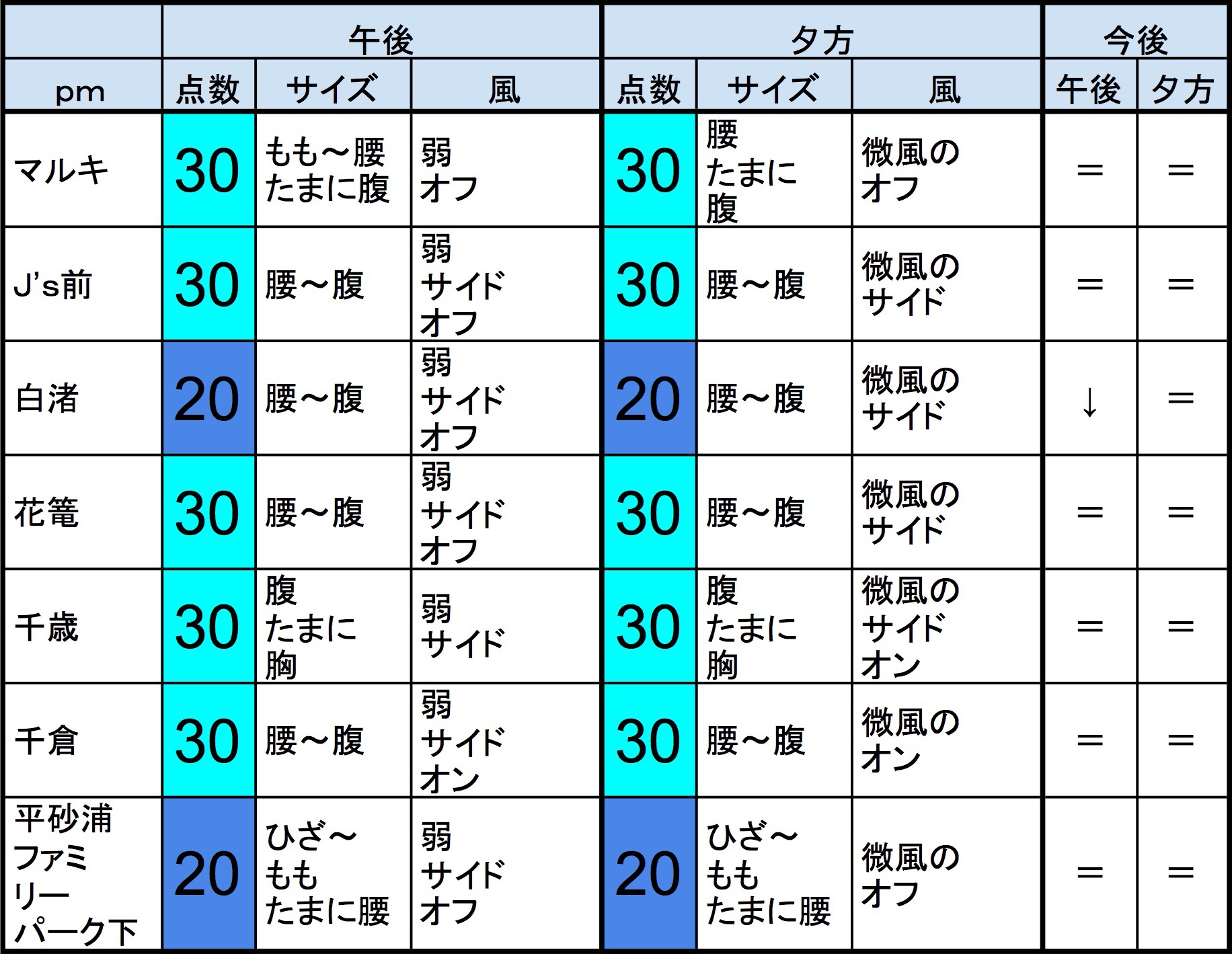 ・早めなら、マルキ、J’s前、白渚、花篭、千歳、千倉、あたり、後半なら、マルキ、J’s前、白渚、花篭、千歳、千倉、あたりが狙い目でしょうか。”