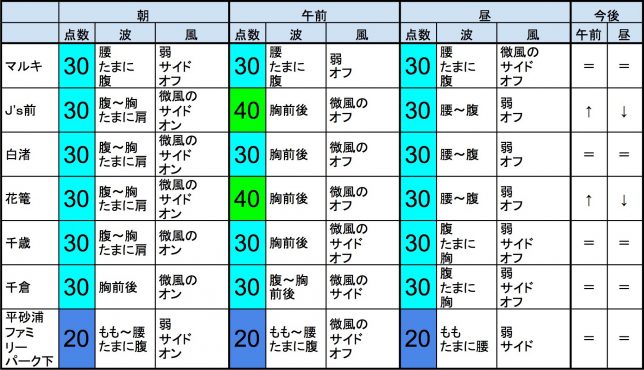 【千葉南エリア】-“・千葉南エリアは腹〜胸〜肩くらいの波、弱めのオンショアベースの風のスタート、多少できそうなコンディションで、午前から昼にかけてもコンディションはそのままキープしそうです。午後から夕方にかけてはコンディションは多少落ちそうです。-