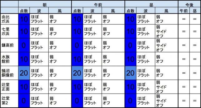 【湘南西エリア】-・湘南 西エリアはほぼフラットに近く、オフショアベースの風のスタート、プアなコンディションで、午前から昼にかけても状況はあまり変わらなさそうです。午後から夕方にかけてはコンディションはあまり期待できなさそうです。-