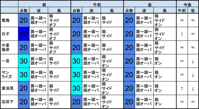 【湘南東エリア】-“・湘南 東エリアはもも〜腰くらいの波、弱めのオフショアベースの風のスタート、プアなコンディションで、午前から昼にかけても状況はあまり変わらなさそうです。午後から夕方にかけてもコンディションはあまり変わらなさそうです。