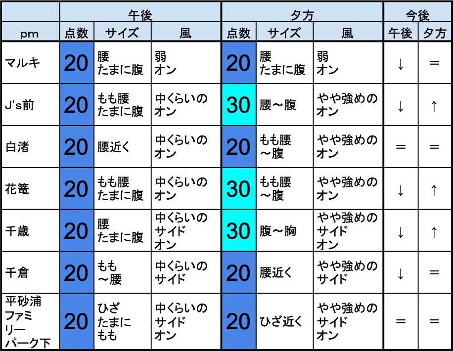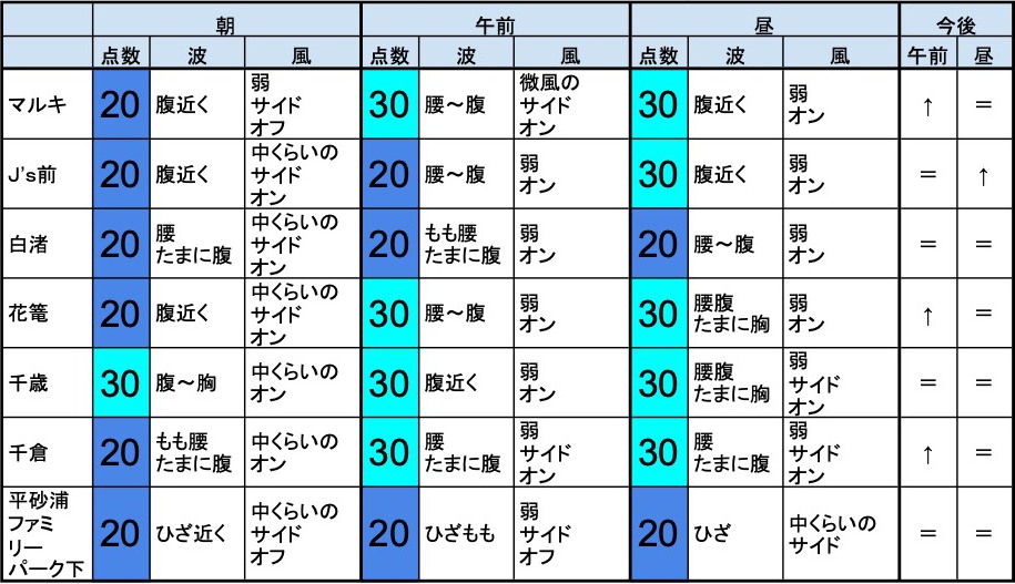 6月13日(木)朝の千葉南の波 2019年6月13日 / U / コメントする 【千葉南エリア】-“・千葉南エリアは腹近くくらいの波、オンショアベースの風のスタート、いまいちなコンディションで、午前から昼にかけても状況はあまり変わらなさそうです。午後から夕方にかけてもコンディションはあまり変わらなさそうです。- ・少し待ってみたほうが上向いてきそうな感じで、マルキ、J’s前、花篭、千歳、千倉、周辺あたり狙いで、という感じでしょうか。”