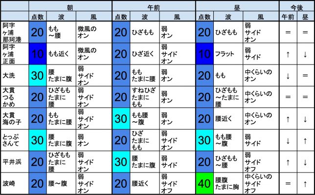 6月21日(金)朝の茨城の波 2019年6月21日 / U / コメントする 【茨城エリア】-“・茨城エリアは腰〜腹くらいの波、弱めのオンショアベースの風のスタート、いまいちなコンディションで、午前から昼にかけても状況はあまり変わらなさそうです。午後から夕方にかけてもコンディションはあまり変わらなさそうです。 ・早めなら、とっぷさんて、作田、あたり、後半なら、作田、あたりが狙い目でしょうか。-“