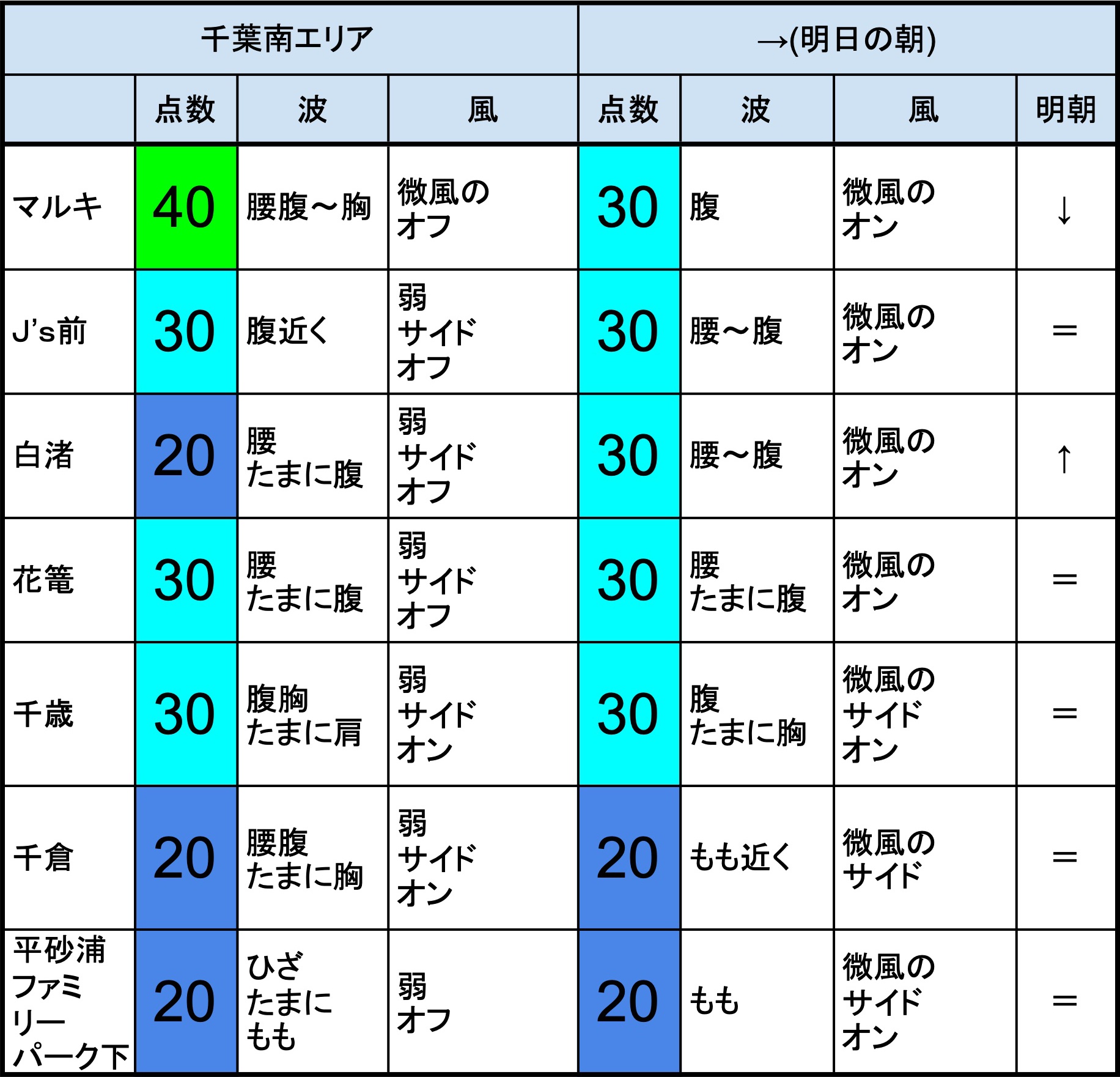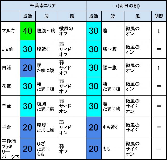 【千葉南エリア】-“・明朝の千葉南エリアはもも腰〜腹くらいの波、弱めのオンショアベースの風、多少できそうなコンディションでのスタートとなりそうです。-