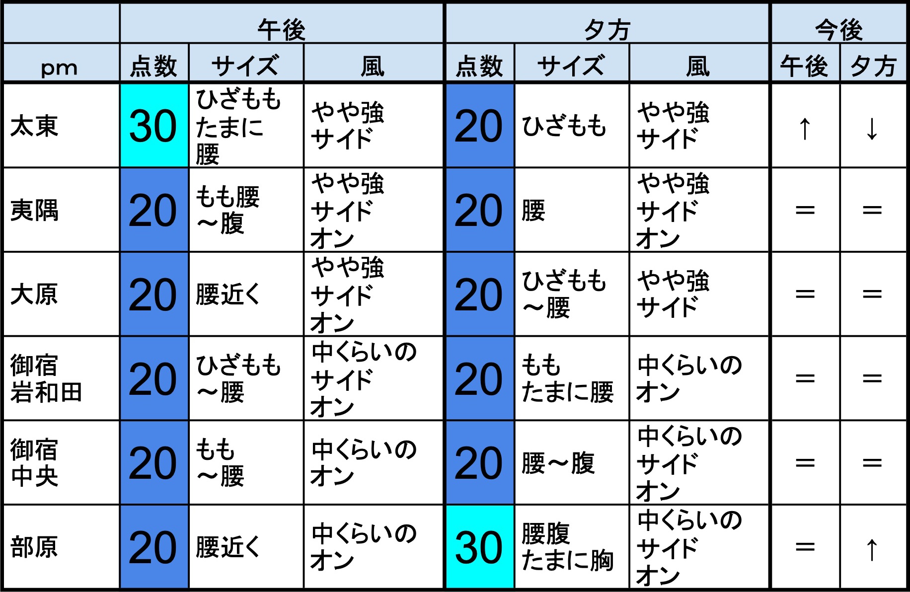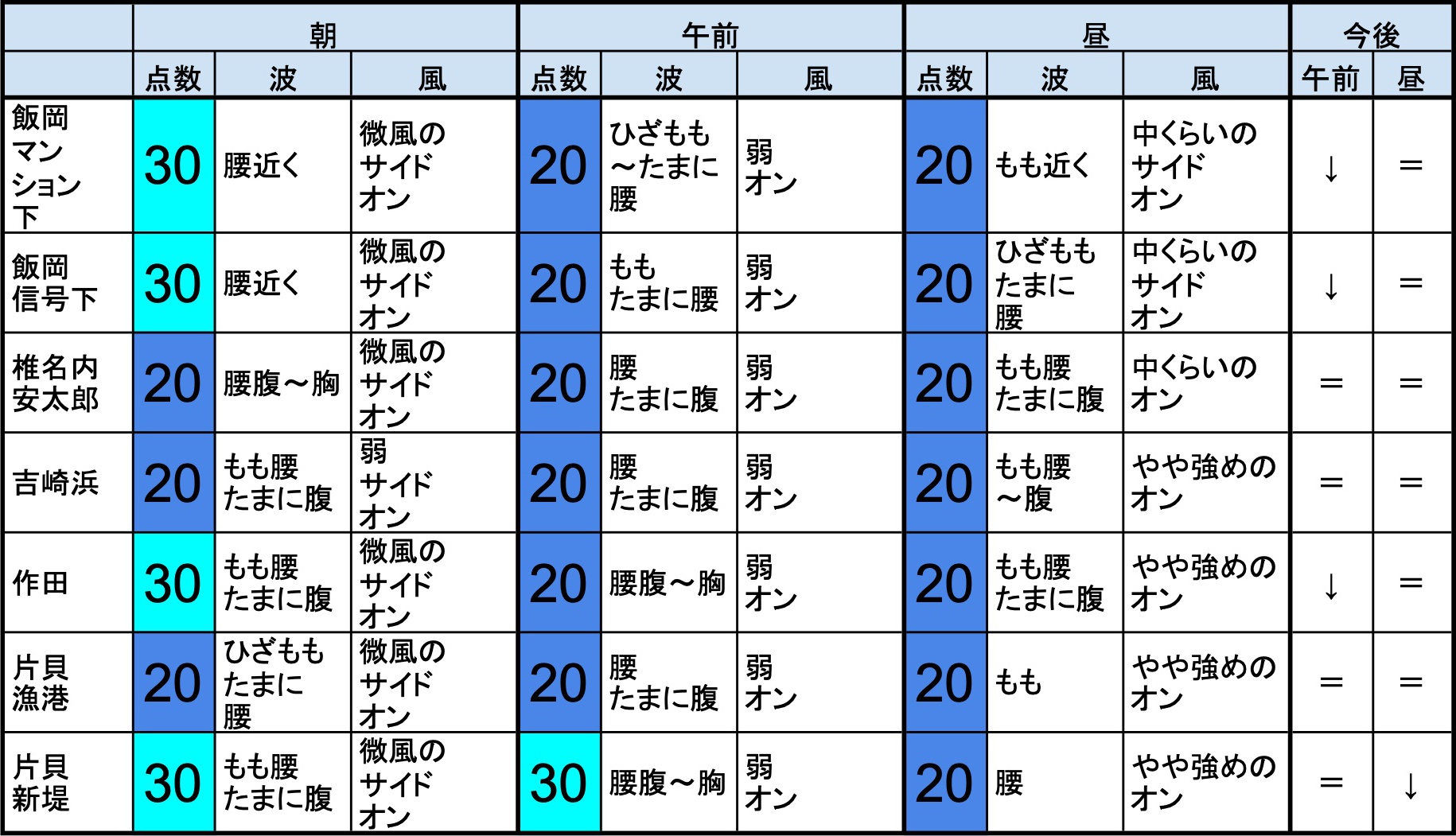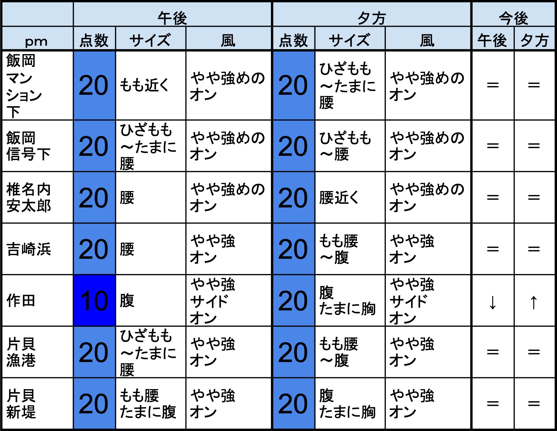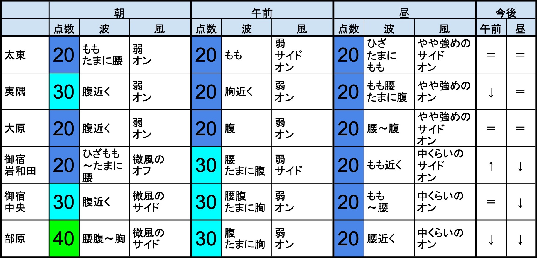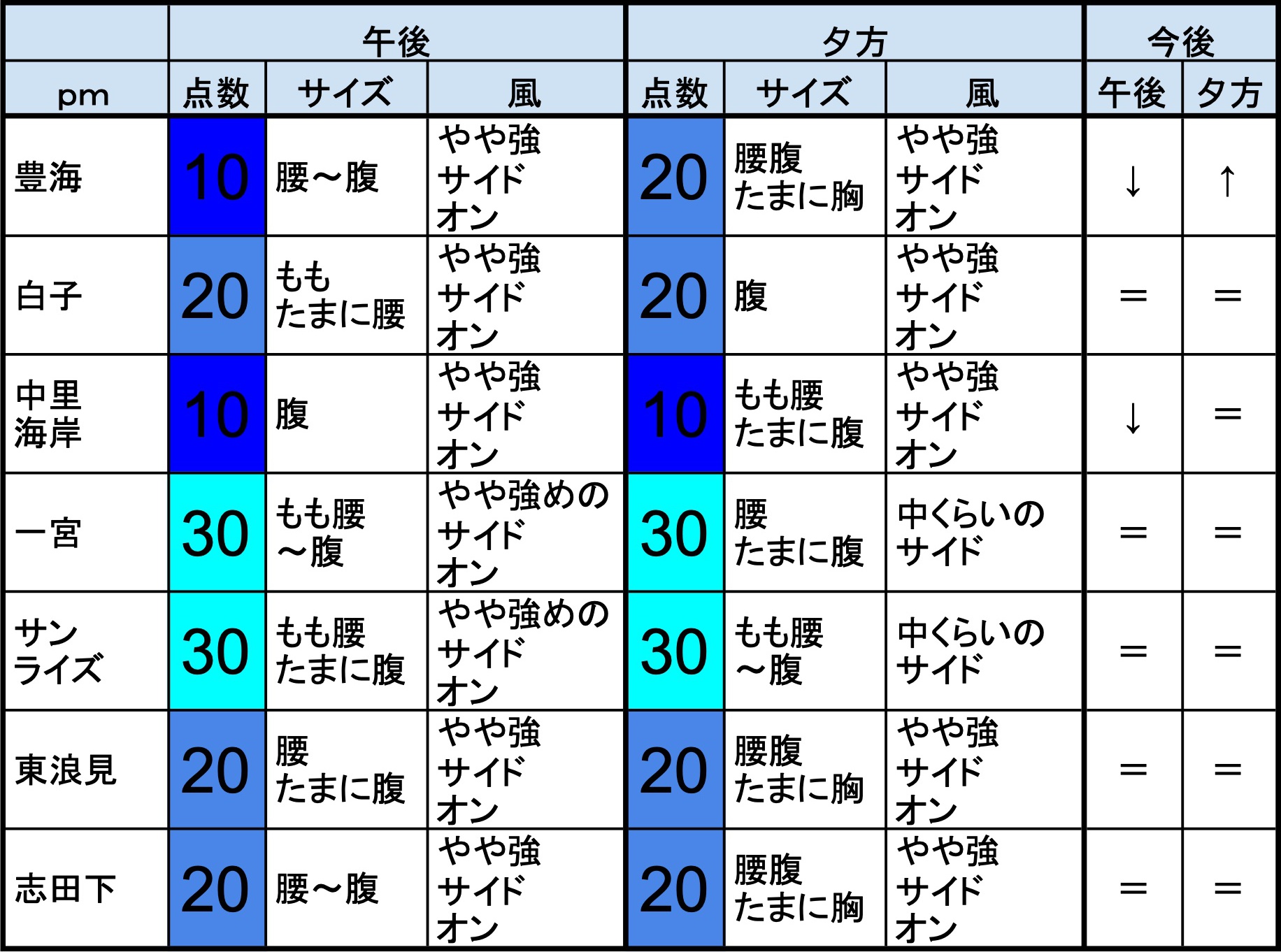 ・早めなら、部原、飯岡マンション下、飯岡信号下、作田、片貝新堤、豊海、一宮、サンライズ、東浪見、志田下、夷隅、御宿中央、あたり、後半なら、一宮、サンライズ、あたりが狙い目でしょうか。-“
