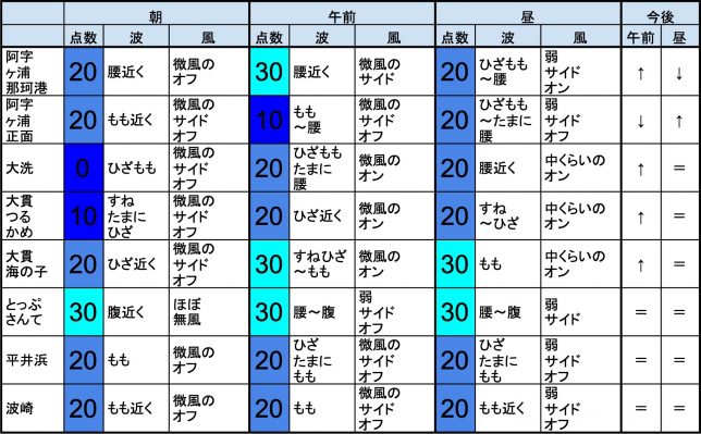 6月26日(水)朝の茨城の波 2019年6月26日 / U / コメントする 【茨城エリア】-“・茨城エリアはもも近くくらいの波、弱めのオフショアベースの風のスタート、プアなコンディションで、午前から昼にかけても状況はあまり変わらなさそうです。午後から夕方にかけてコンディションは上向いてきそうです。 ・早めなら、とっぷさんて、あたり、後半なら、とっぷさんて、大貫海の子、あたりが狙い目でしょうか。-“
