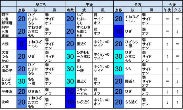6月27日(木)昼ごろの茨城の波 2019年6月27日 / U / コメントする 【茨城エリア】-“・茨城エリアはひざ〜ももくらいの波、弱めの風、プアなコンディションで、午後から夕方にかけても状況はあまり変わらなさそうです。 ・早めなら、とっぷさんて、あたり、後半なら、大貫つるかめ、大貫海の子、あたりが狙い目でしょうか。-“