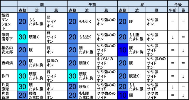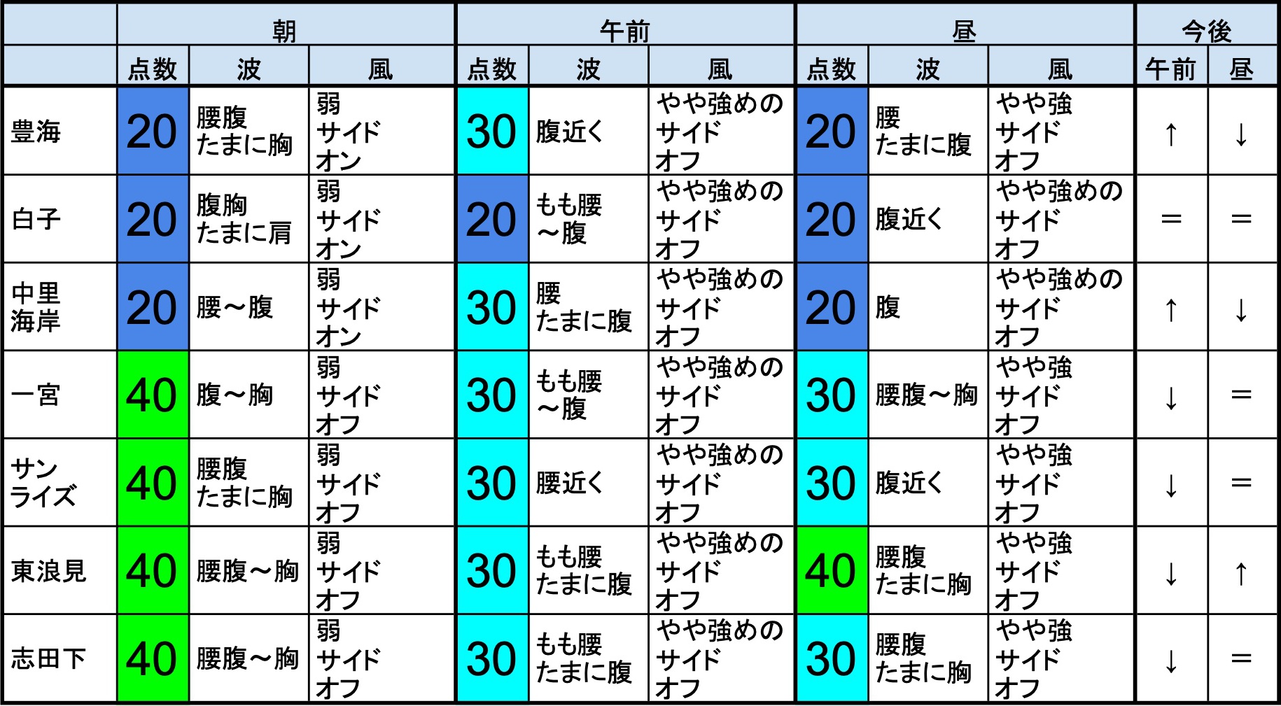 【千葉北 北部エリア】-“・千葉北 北部エリアは腰腹〜胸くらいの波、弱めのオンショアベースの風のスタート、それほど良くなくても場所を選んで多少できそうなコンディションで、午前から昼にかけてもコンディションはそのままキープしそうです。午後から夕方にかけてはコンディションは多少落ちそうです。