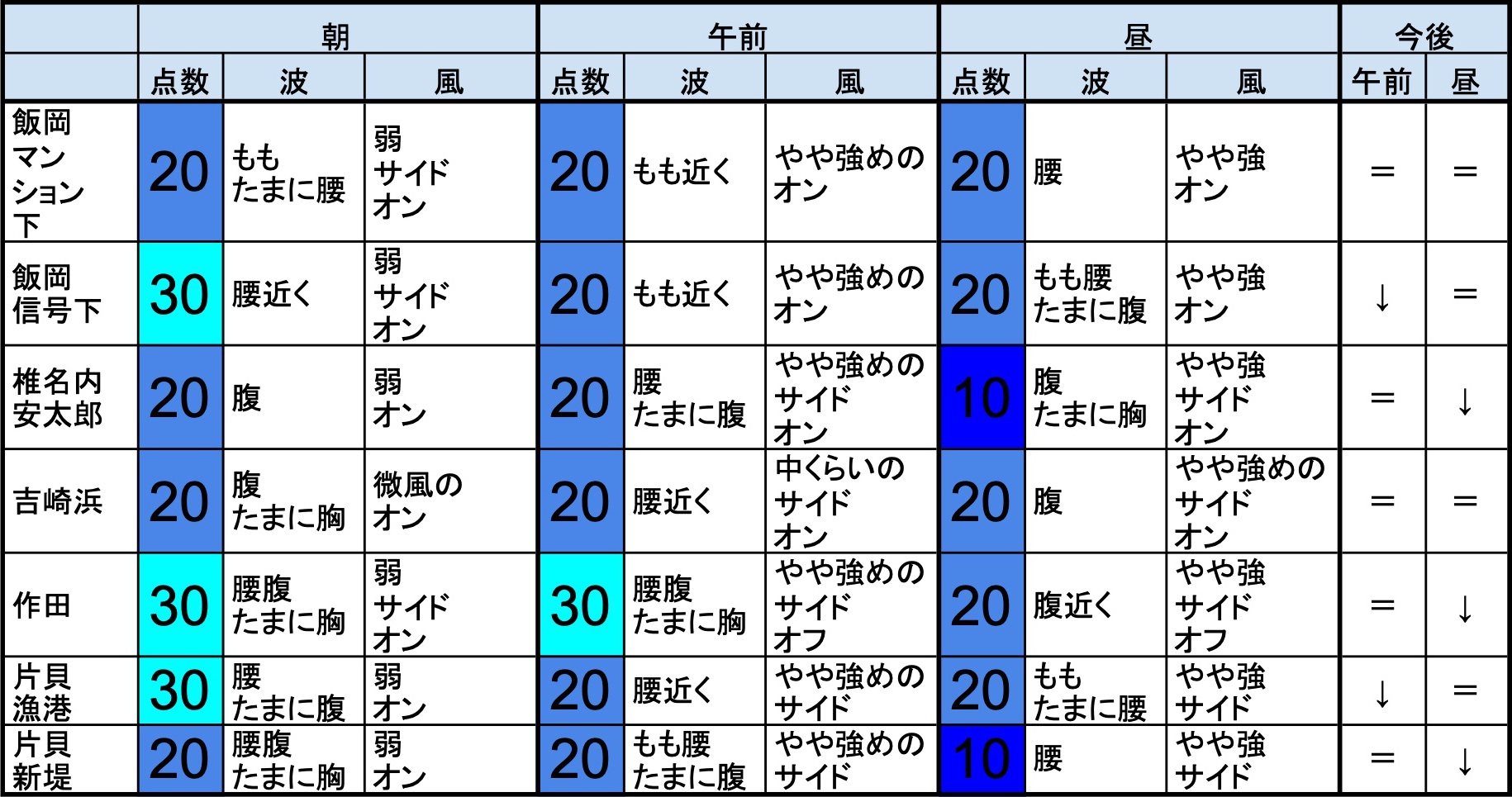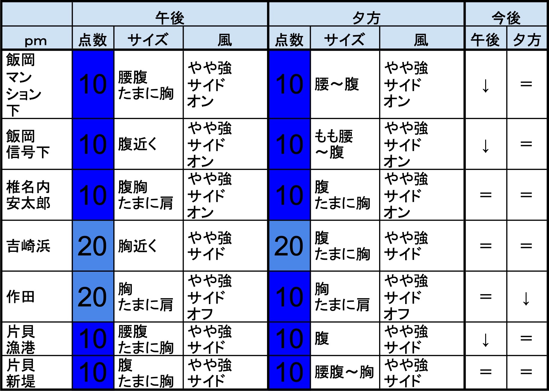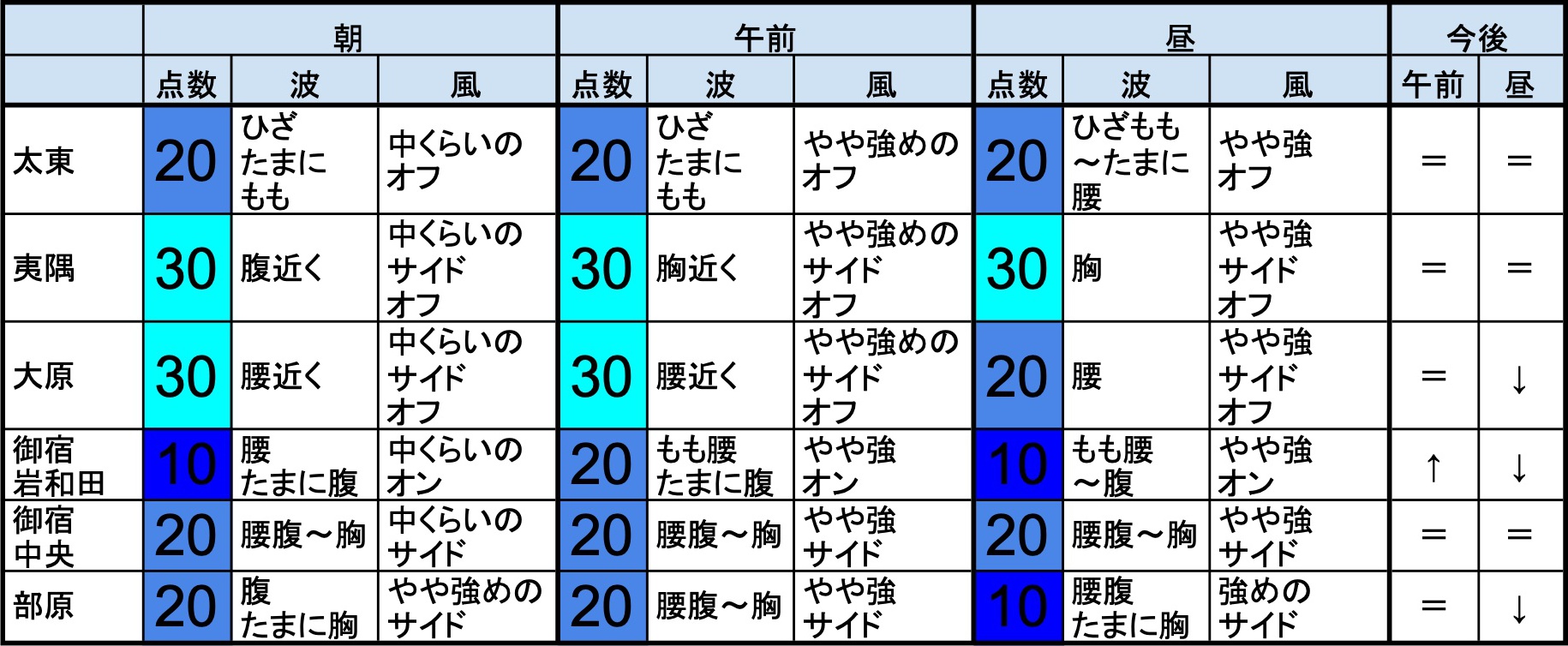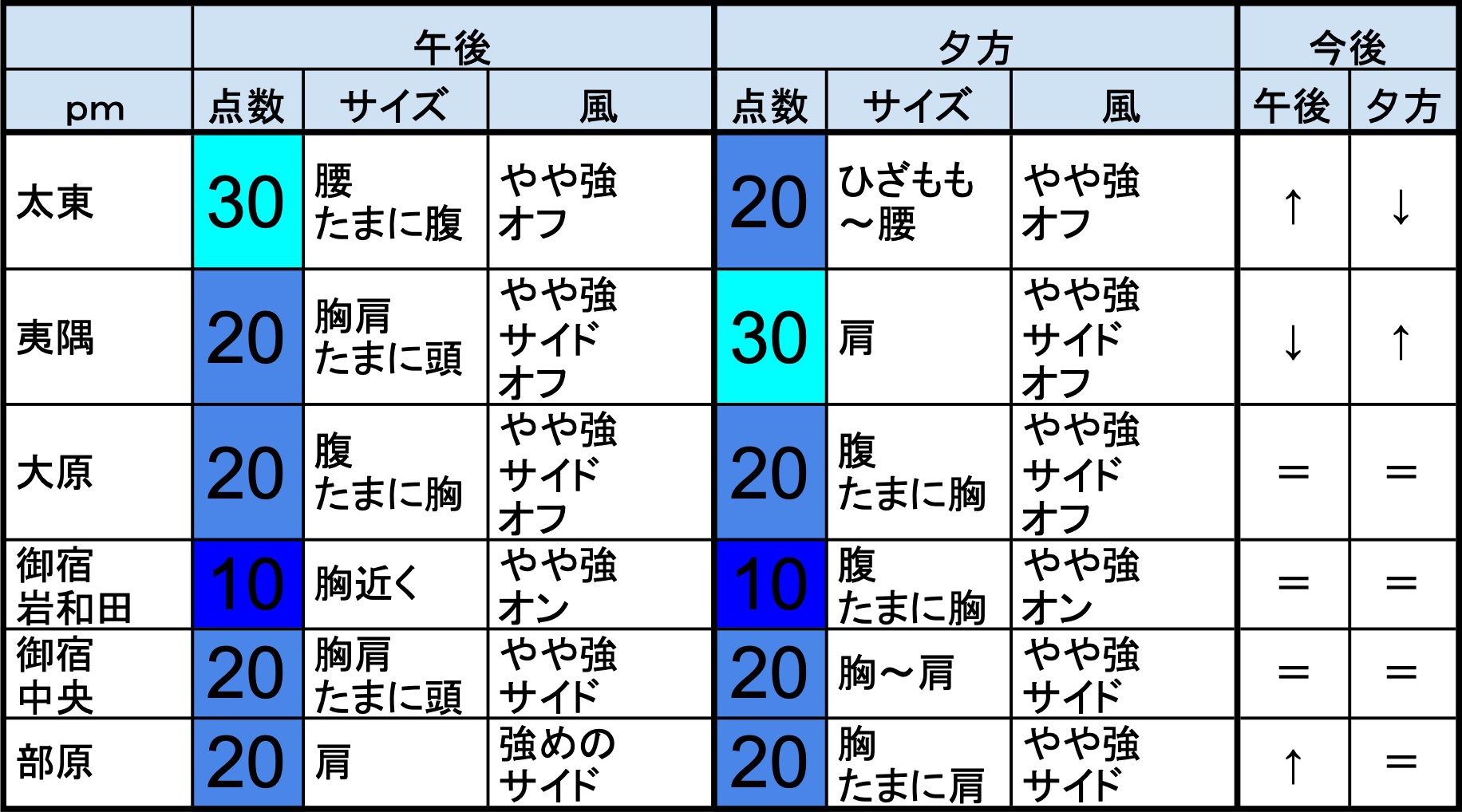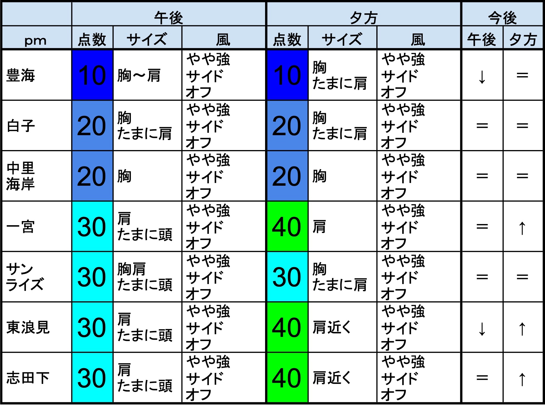 ・早めなら、一宮、サンライズ、東浪見、志田下、飯岡信号下、作田、片貝漁港、夷隅、大原、あたり、後半なら、一宮、サンライズ、志田下、夷隅、あたりが狙い目でしょうか。-“