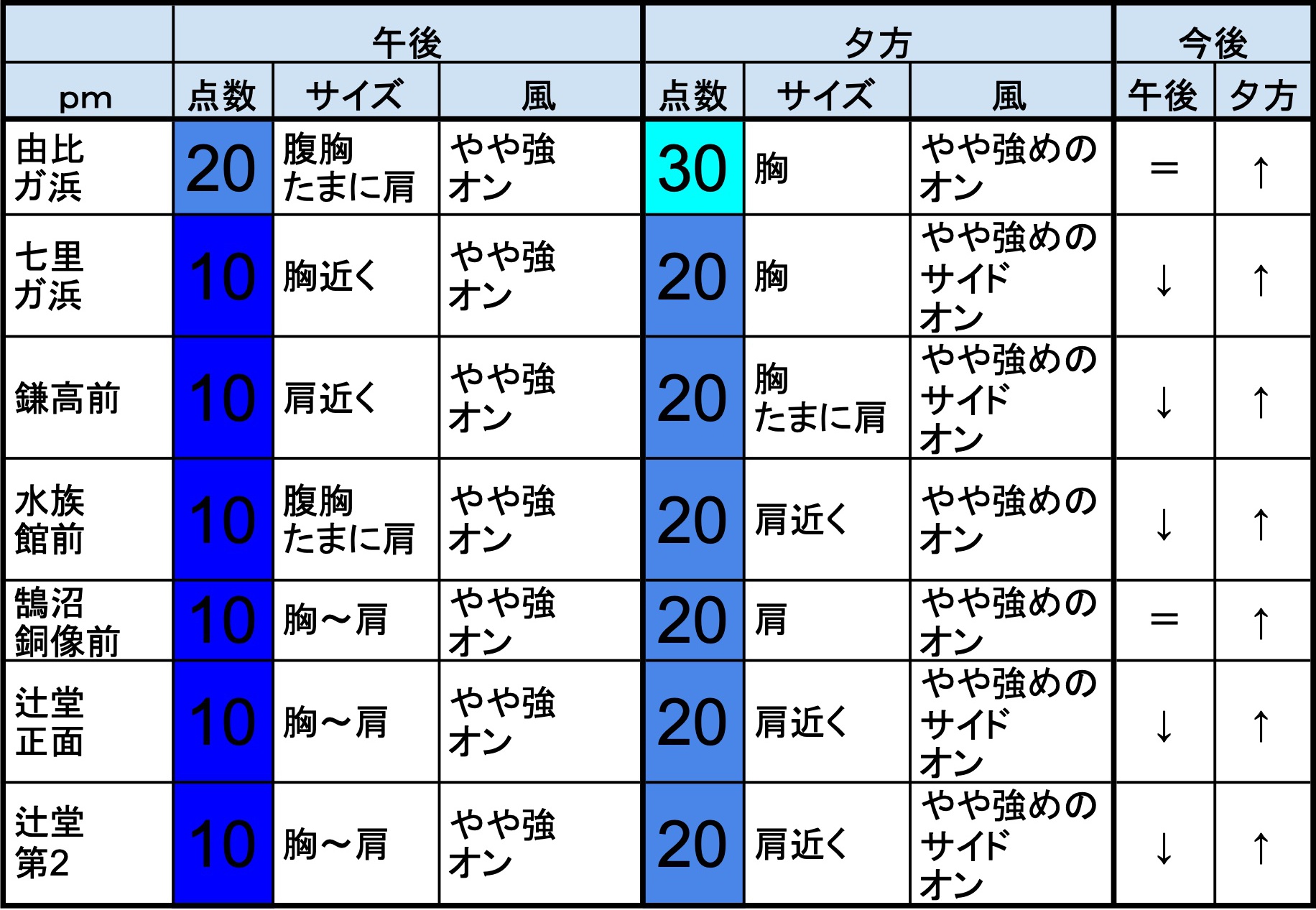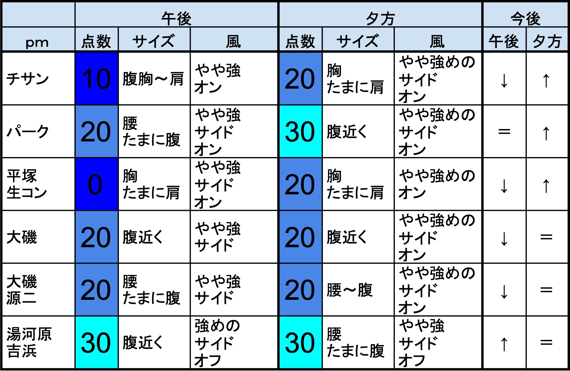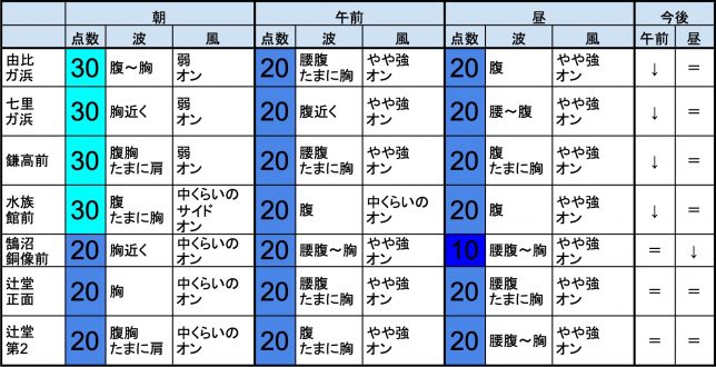 【湘南東エリア】-“・湘南 東エリアは胸近くくらいの波、オンショアベースの風のスタート、それほど良くなくても場所を選んで多少できそうなコンディションで、午前から昼にかけてコンディションは下向きそうです。午後から夕方にかけてはコンディションは多少落ちそうです。