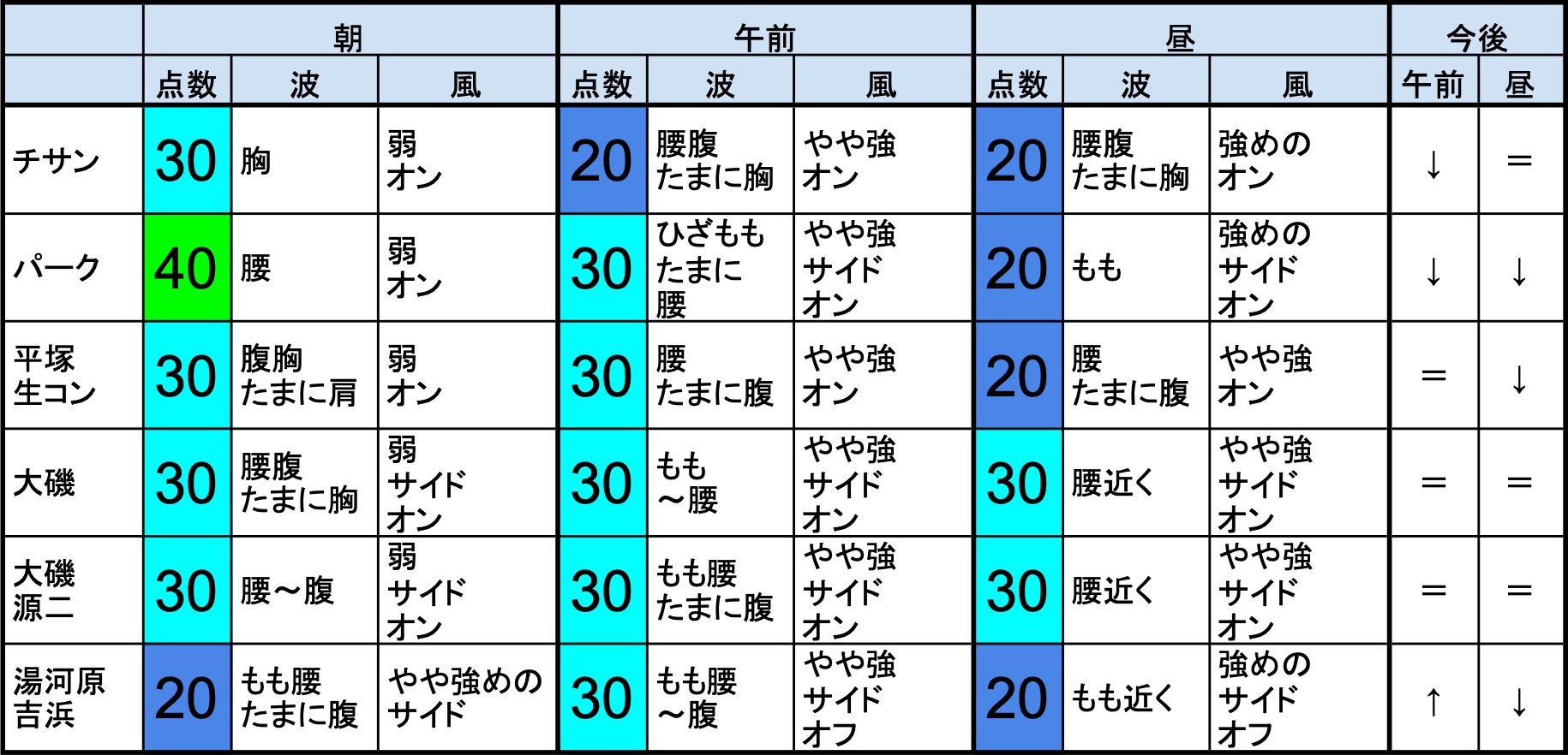 【湘南西エリア】-・湘南 西エリアは腰くらいの波、弱めのオンショアベースの風のスタート、多少できそうなコンディションで、午前から昼にかけてもコンディションはそのままキープしそうです。午後から夕方にかけてはコンディションは多少落ちそうです。-