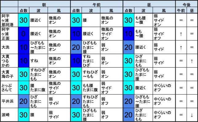 【茨城エリア】-“・茨城エリアは腰近くくらいの波、弱めのオンショアベースの風のスタート、プアなコンディションで、午前から昼にかけても状況はあまり変わらなさそうです。午後から夕方にかけてもコンディションはあまり変わらなさそうです。