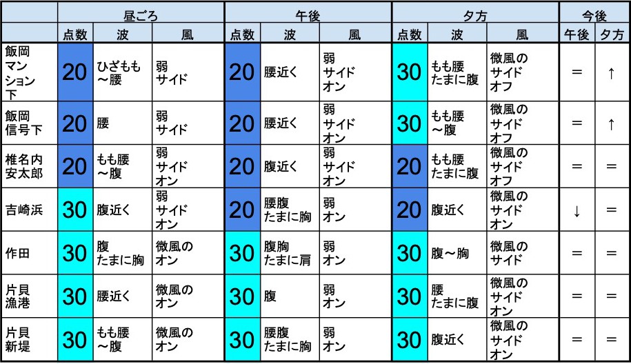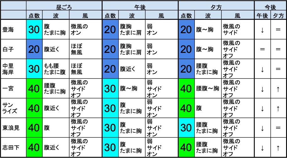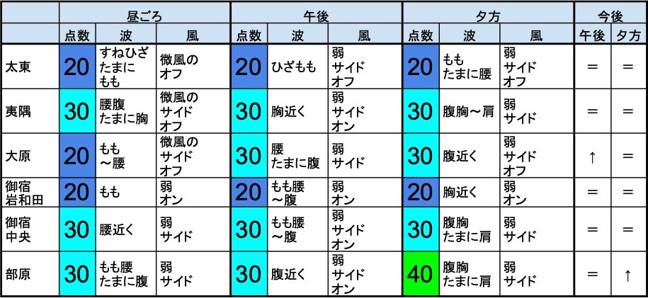 【千葉北 南部エリア】-・千葉北 南部エリアは腰腹たまに胸くらいの波、弱めのオフショアベースの風、それほど良くなくても場所を選んで多少できそうなコンディションで、午後から夕方にかけてもコンディションはそのままキープしそうです。-