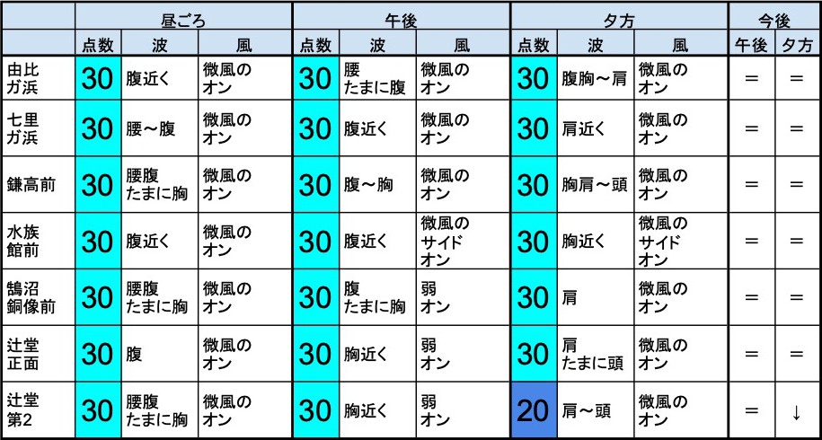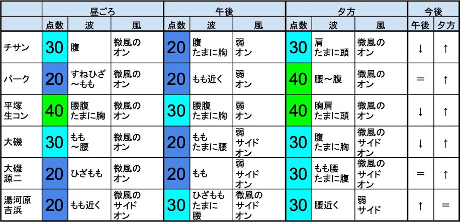 ・早めなら、平塚生コン、由比ガ浜、七里ガ浜、鎌高前、水族館前、鵠沼銅像前、辻堂正面、辻堂第2、チサン、大磯、あたり、後半なら、由比ガ浜、七里ガ浜、鎌高前、水族館前、鵠沼銅像前、辻堂正面、チサン、大磯、大磯源二、湯河原吉浜、あたりが狙い目でしょうか。-少し待ってみると、さらにコンディションが上向いてくる可能性もあると思います。”