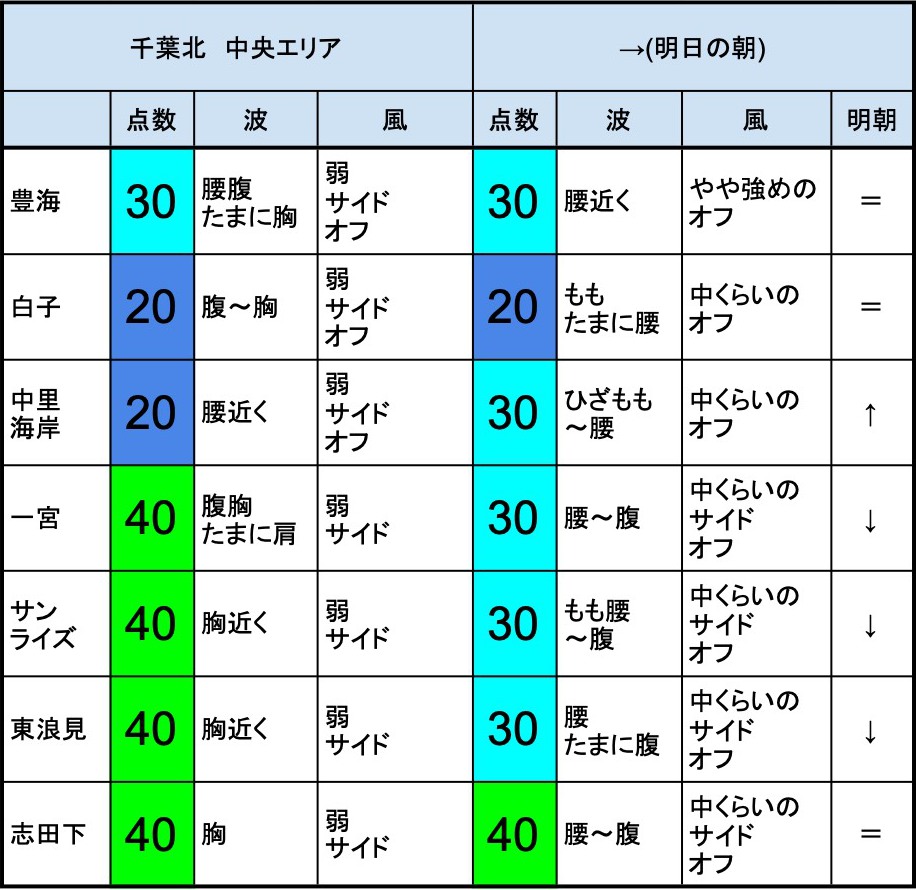 【千葉北 中央エリア】-・明朝の千葉北 中央エリアはもも腰たまに腹くらいの波、オフショアベースの風、多少できそうなコンディションでのスタートとなりそうです。-