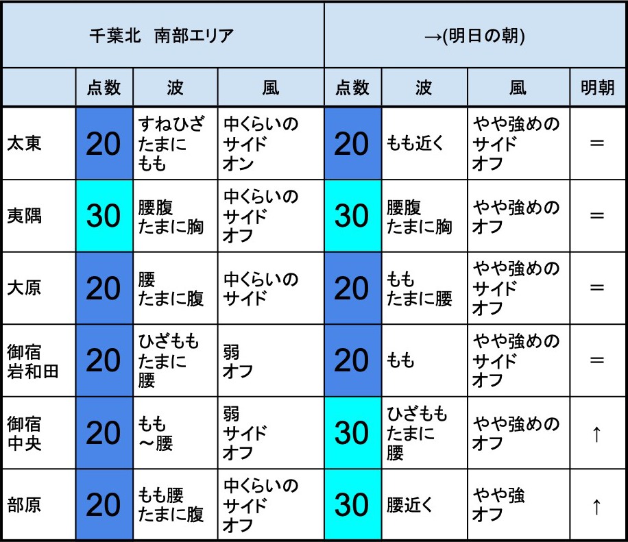 【千葉北 北部エリア】-“・明朝の千葉北 北部エリアはひざももたまに腰くらいの波、オフショアベースの風、プアなコンディションでのスタートとなりそうです。