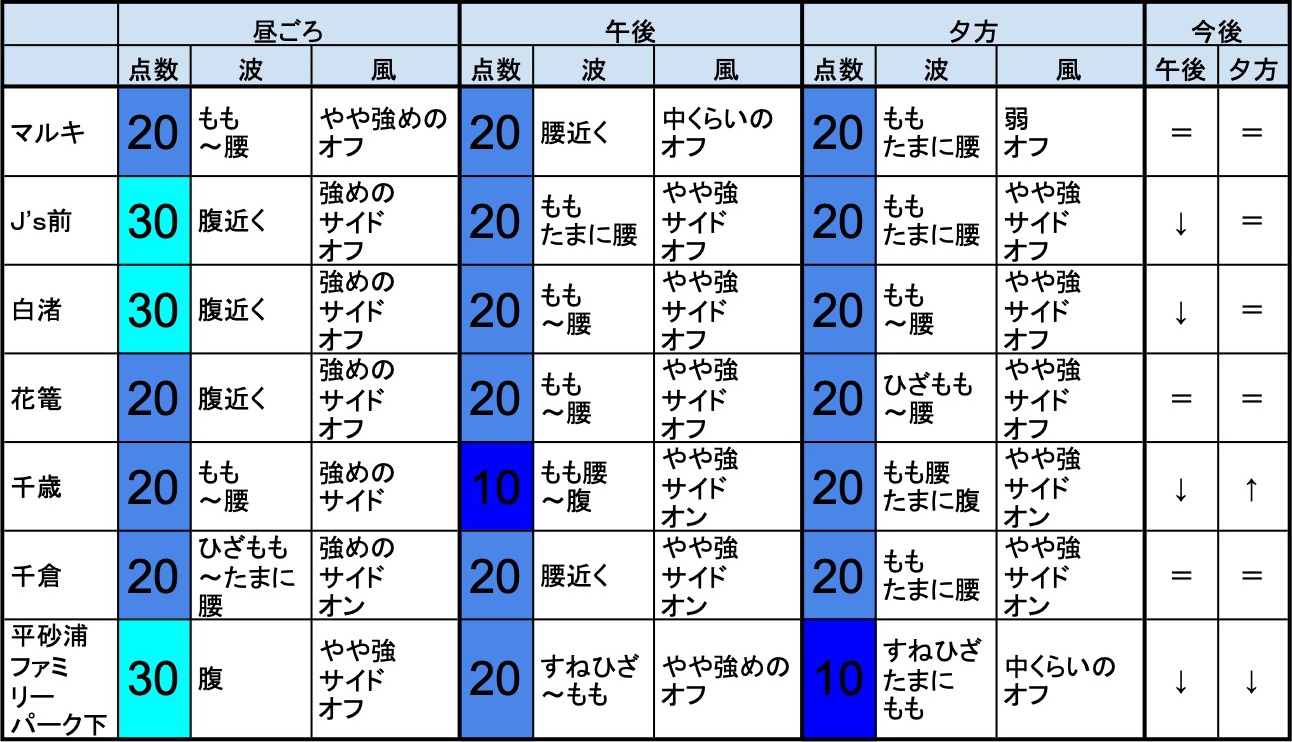 11月20日(水)昼ごろの千葉南の波 2019年11月20日 / U / コメントする 【千葉南エリア】-“・千葉南エリアは腹近くくらいの波、オフショアベースの風、それほど良くなくても場所を選んで多少できそうなコンディションで、午後から夕方にかけてコンディションは下向きそうです。- ・徐々にコンディションが落ちていく可能性もありますので、早めに、J’s前、白渚、平砂浦ファミリーパーク下、周辺あたりで、という感じでしょうか。”